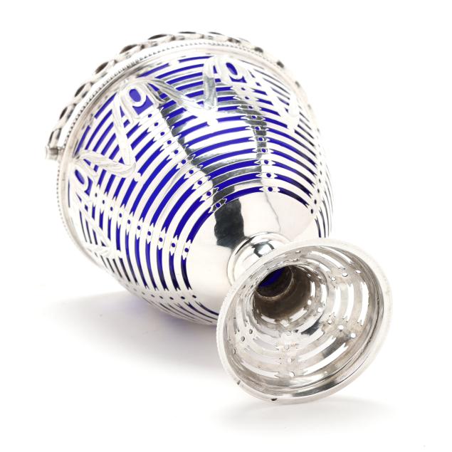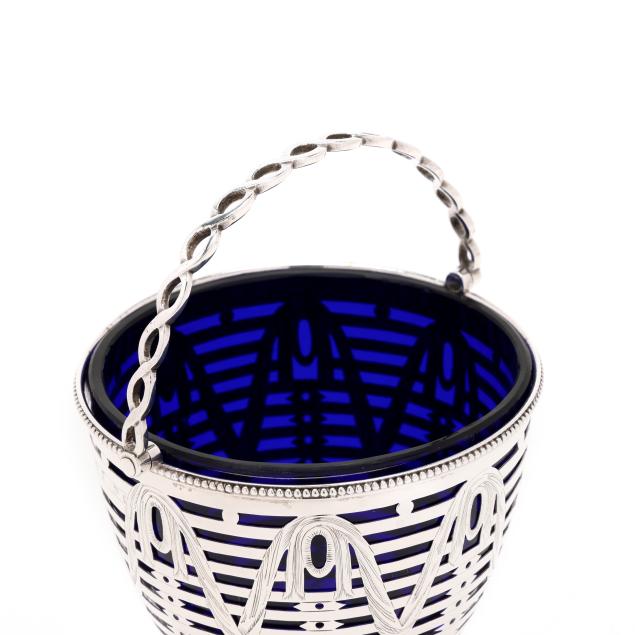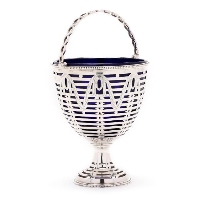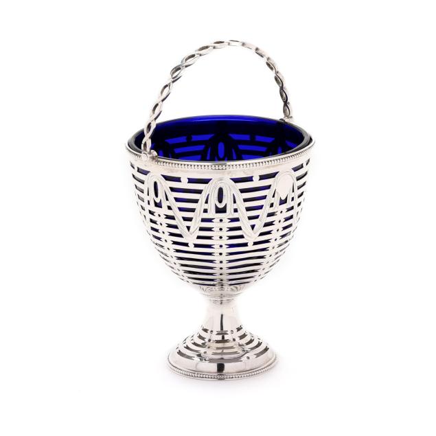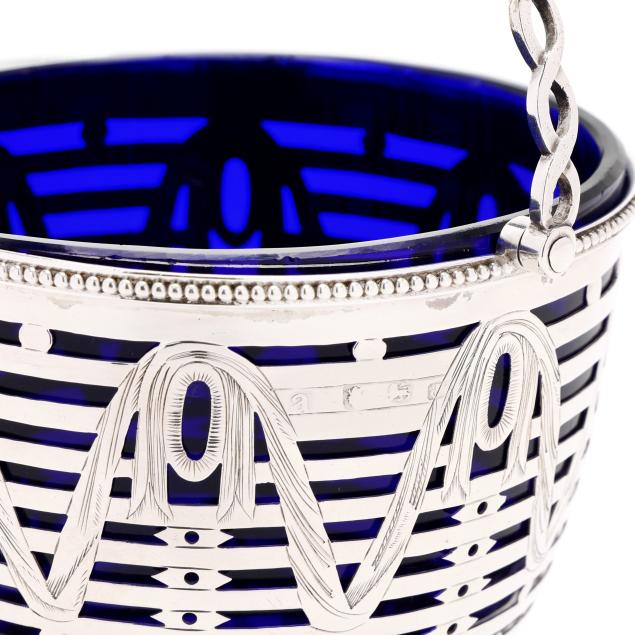 London (1775), featuring a finely cut body and foot hand engraved with drapery to the shoulder, bead course rim, and an undulating swing handle, with the likely original cobalt glass insert.