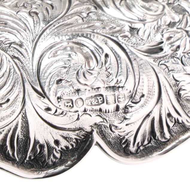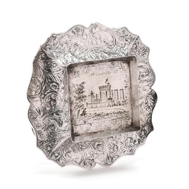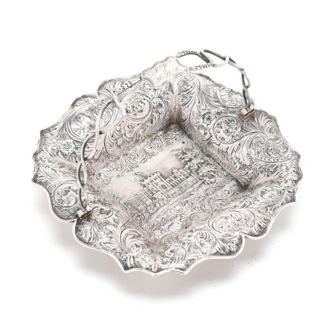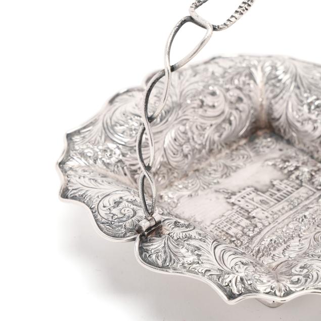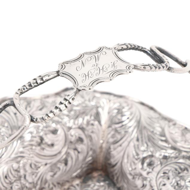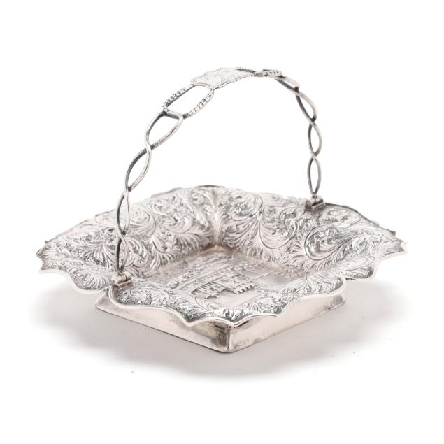 Birmingham (1844), featuring a repousse castle scene to the well and a scrolled flange with hand-chased foliate motifs, topped with a swing handle featuring entwined serpent motifs, monogrammed "F H H / to / N W".