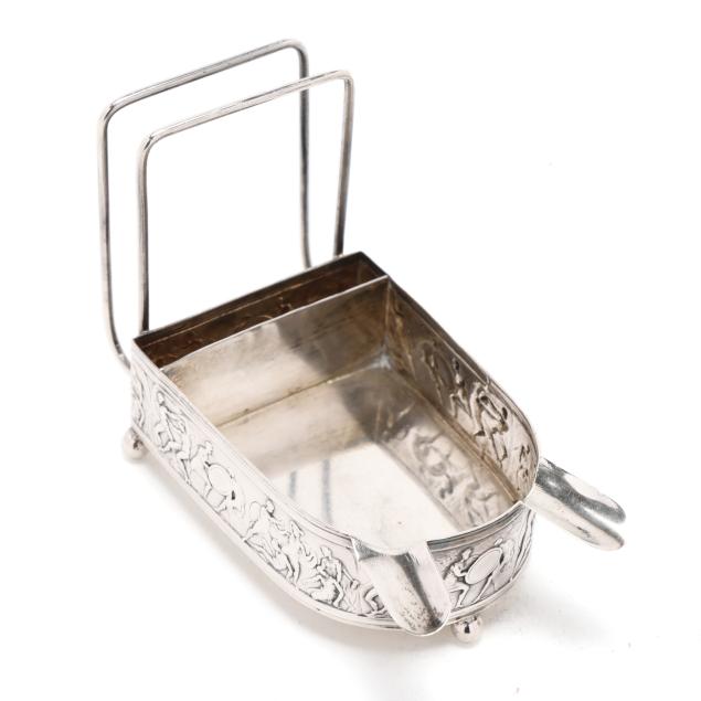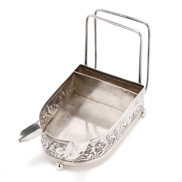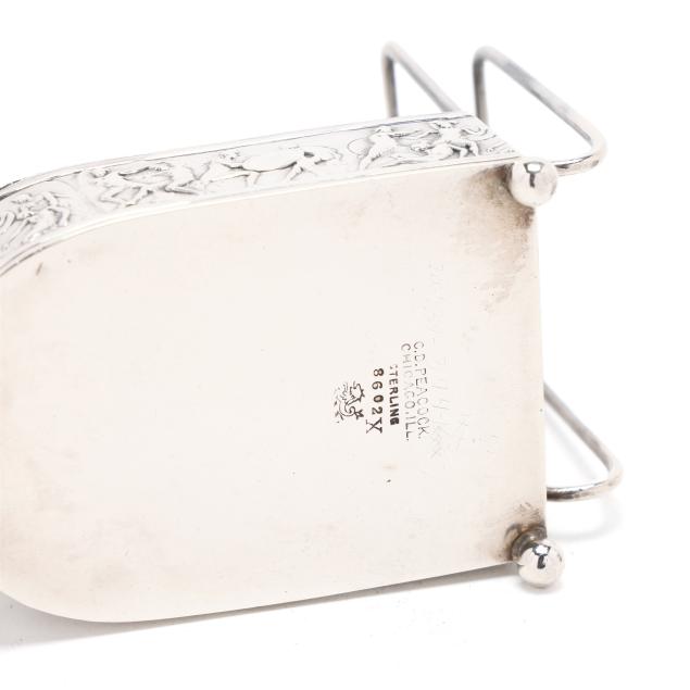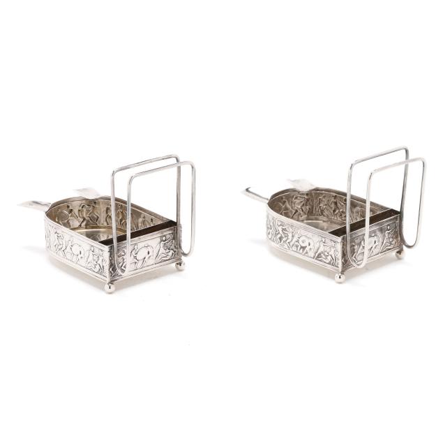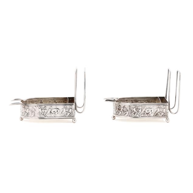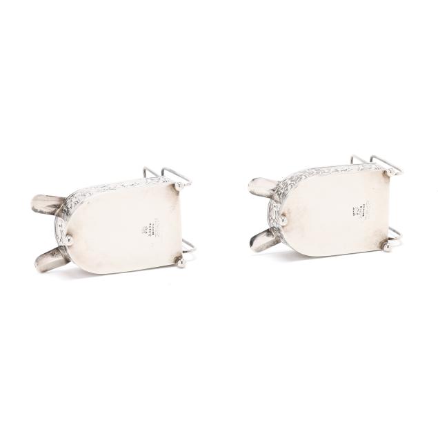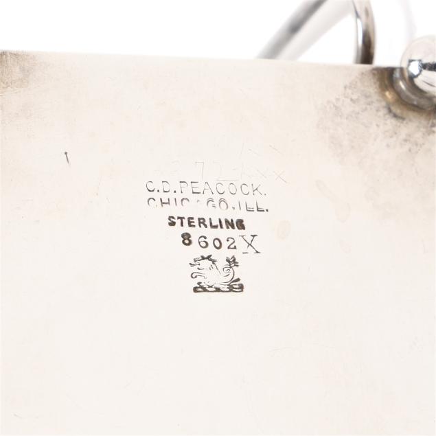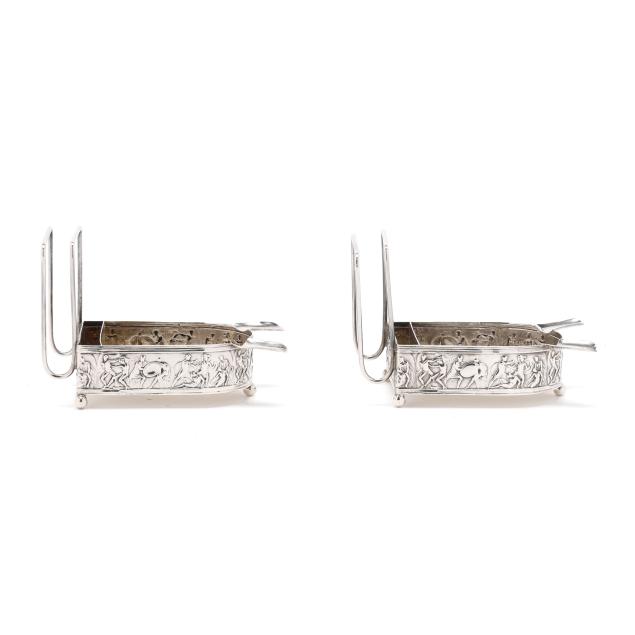 Pattern number 8602X, mark of C. D. Peacock, Chicago, each featuring a classical relief frieze base, raised on three ball feet, with two cigarette rests, and a matchbox holder, not monogrammed.