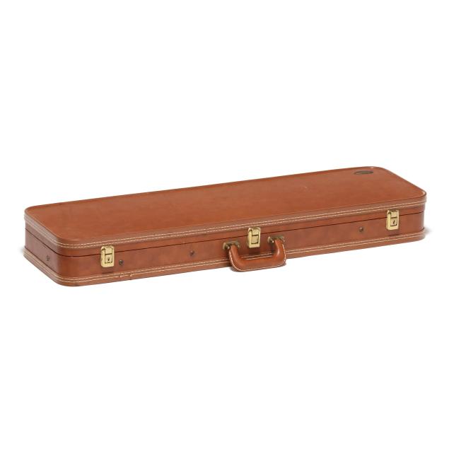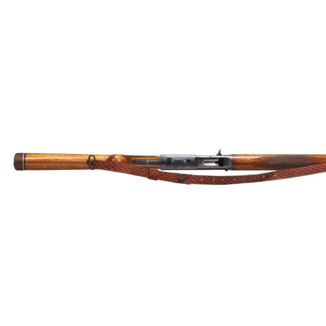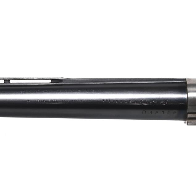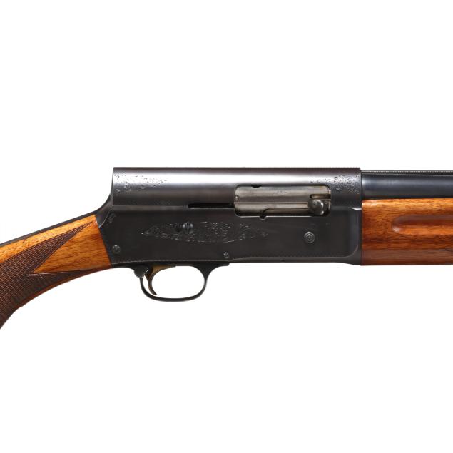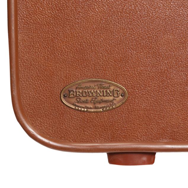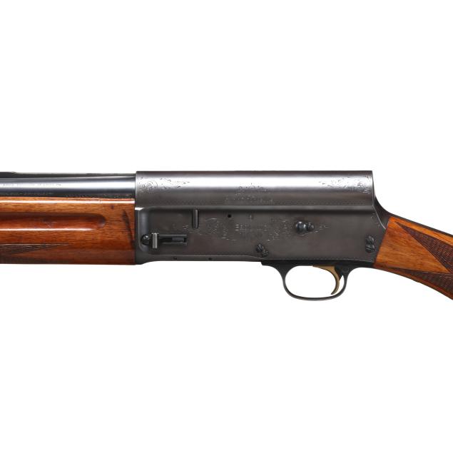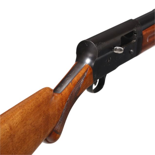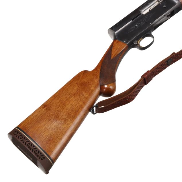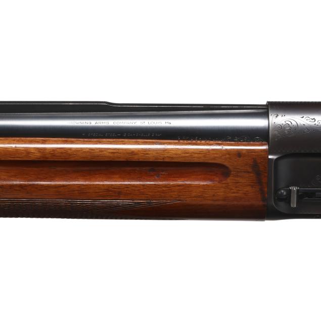 Serial number 8G25450 present on belly of blued semi-automatic receiver, text of BROWNING LIGHT TWELVE present along left side of lightly engraved receiver, text of BROWNING ARMS COMPANY ST. LOUS MO. & MONTREAL P.Q. MADE IN BELGIUM and SPECIAL STEEL - 12GA - SHELLS 2 3/4" present on 27 in. blued steel barrel with matted solid rib first barrel and single bead, second barrel is 29 1/2 in. with matted vent rib and single bead, gold washed trigger, manual safety, two piece carrier, sling studs, sling, checkered walnut stock with Prince Of Wales grip and forend, factory buttplate, case with additional recoil springs and magazine tube plug.