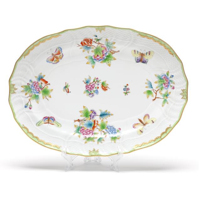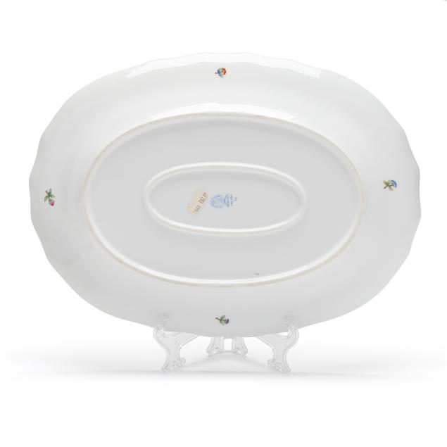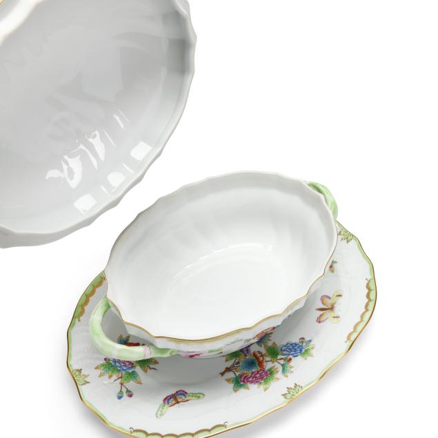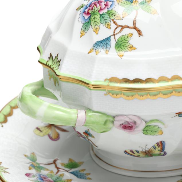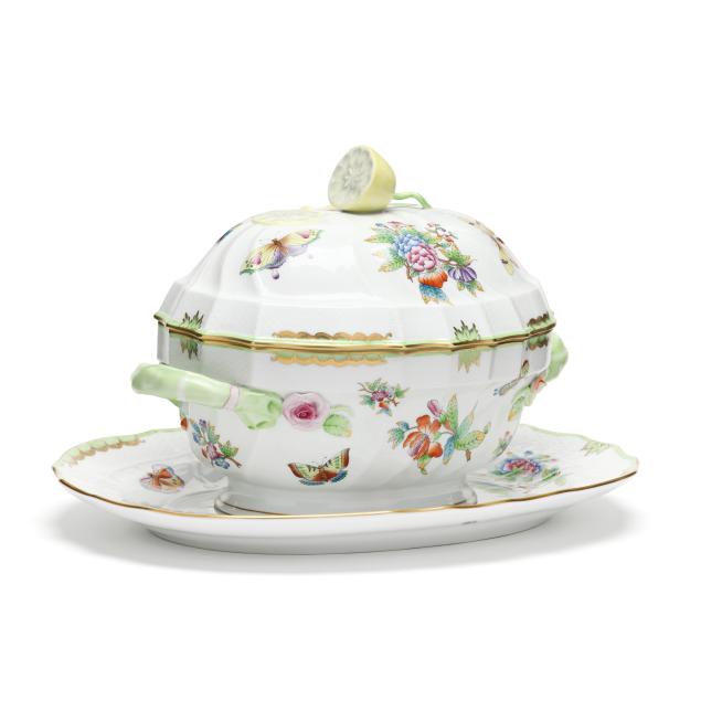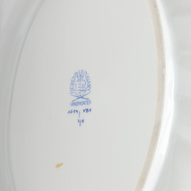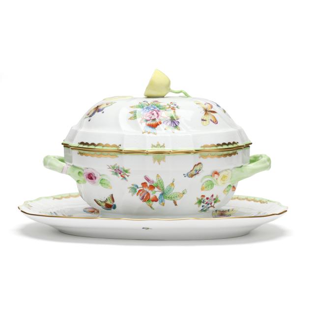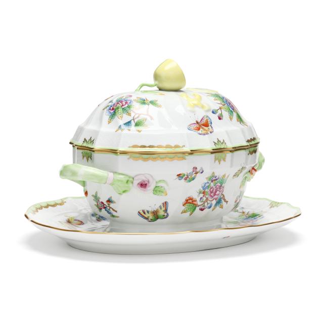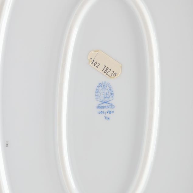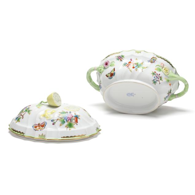Hungary, hand-painted and gilt porcelain, (2) pieces to include an oval tureen with branch handles and applied flowers, the lid bears an applied cut lemon finial #1014 (9 x 12 5/8 x 8 in. with lid); and an oval tray #1102 (15 in.), both marked with company backstamp to underside.