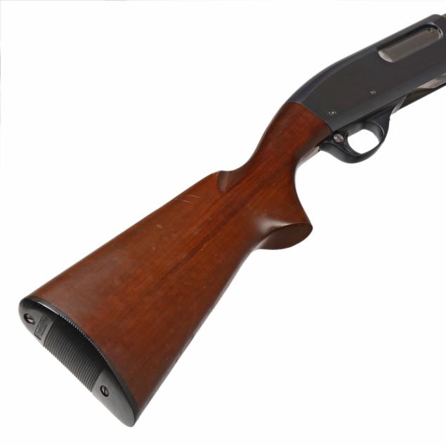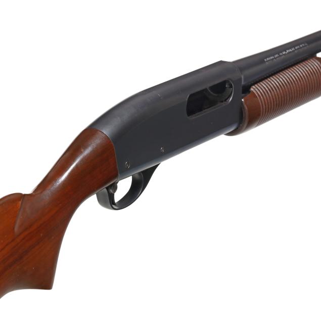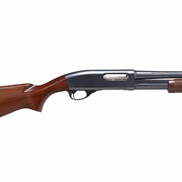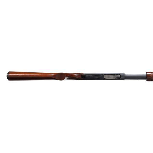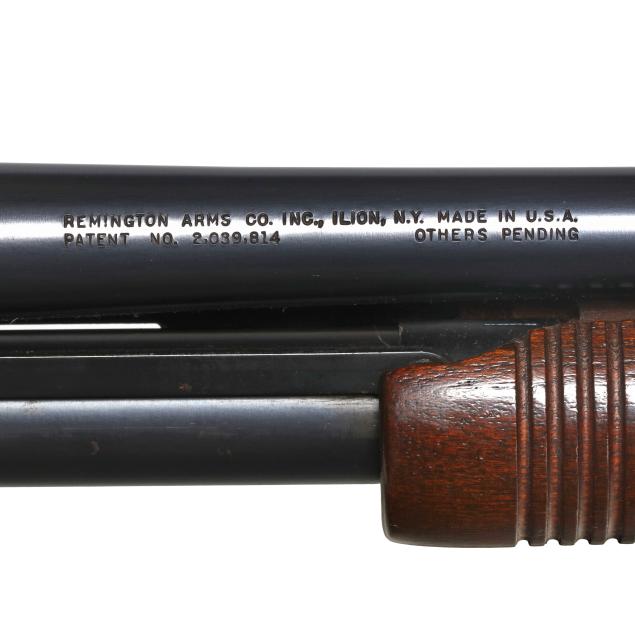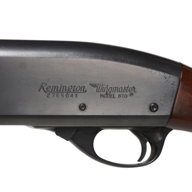 Serial number 276504X and REMINGTON WINGMASTER MODEL 870 present on left side of blued pump-action receiver, text of REMINGTON ARMS CO. INC. ILION N.Y. MADE IN U.S.A. and 20GA FOR 2 3/4 OR SHORTER SHELLS I,P CYL. present on 26 in. blued steel barrel, manual safety, smooth walnut buttstock, corn cob walnut forend, factory buttplate.