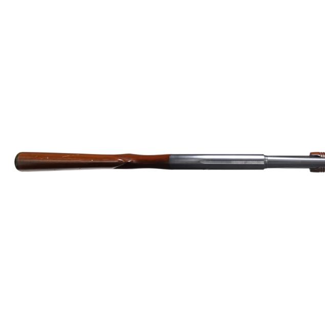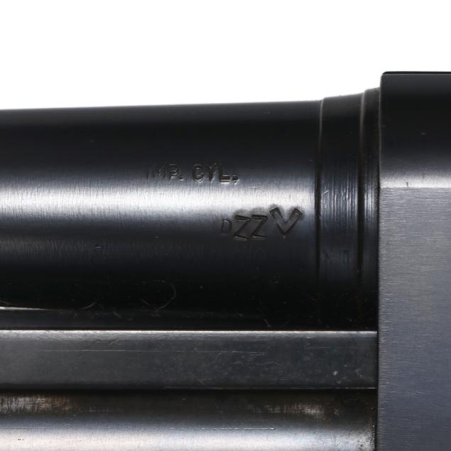 Overall excellent estate condition, bluing strong over all surfaces, slight amount of faint surface rust as back left edge of action at stock junction, bright and shiny bore, stock finish is somewhat muted and dull with scattered field marks overall and one deep scratch along left side, forend finish is strong.