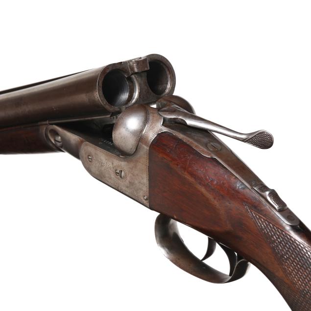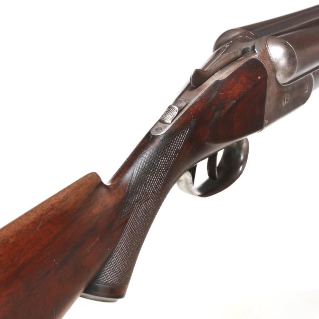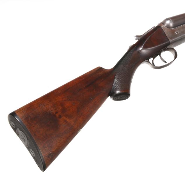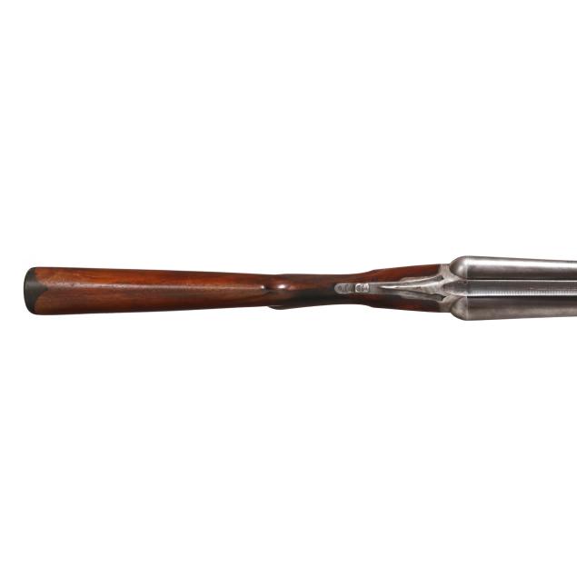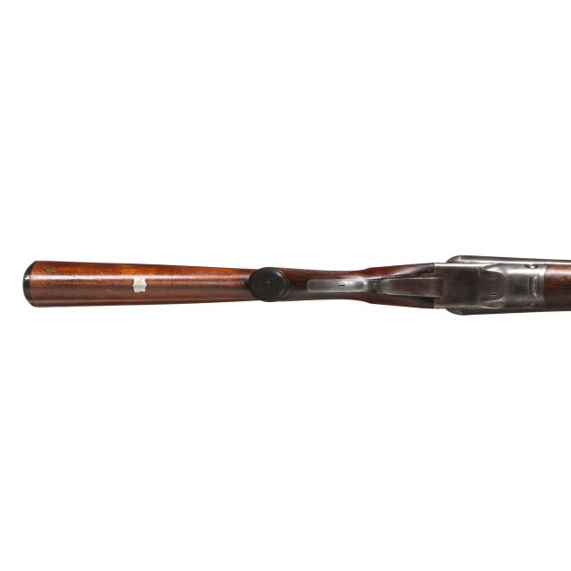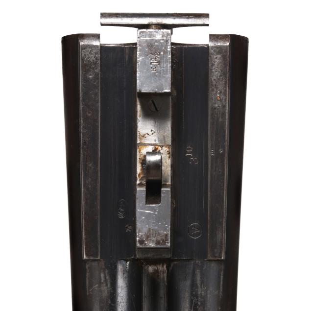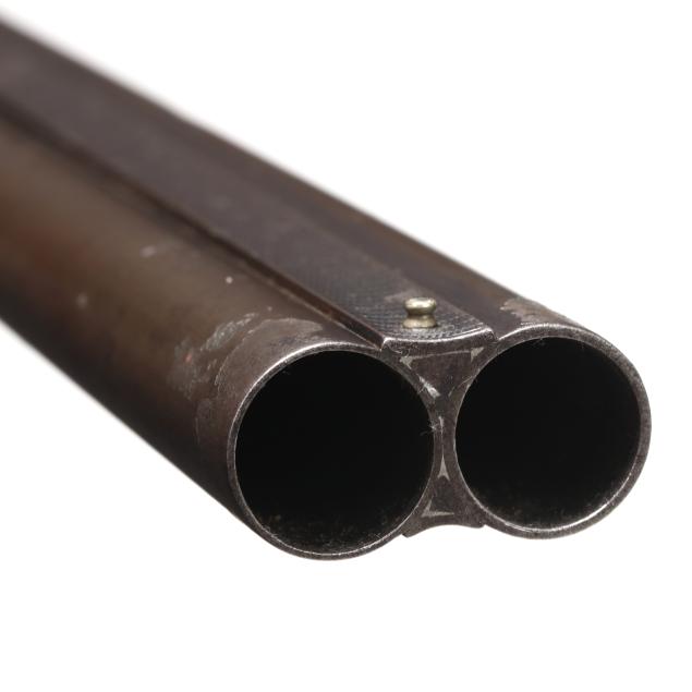 Overall fair estate condition, bore is bright and shiny with signs of prior dent damage being raised, scattered moderate to light pitting in both bores throughout, barrel ring with a muted tone, barrel to action fit is tight, all metal surfaces show worn finishes and old brownish silver patina, moderate pitting around the muzzles and few other spots, screw slot damage can be found, stock and forend show evidence of significant use with dents, dings and gouges over all surfaces, checking remains clear and evident on buttstock while worn nearly smooth on forend with the pattern still visible.