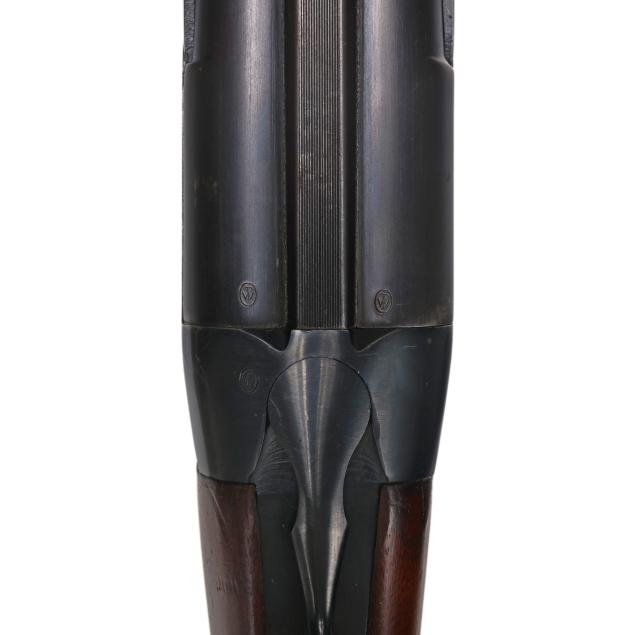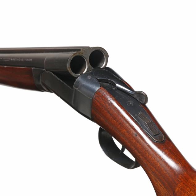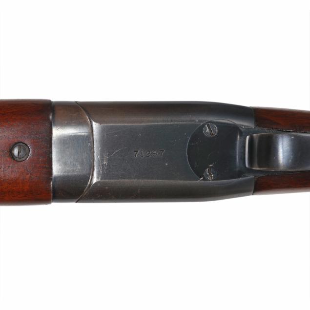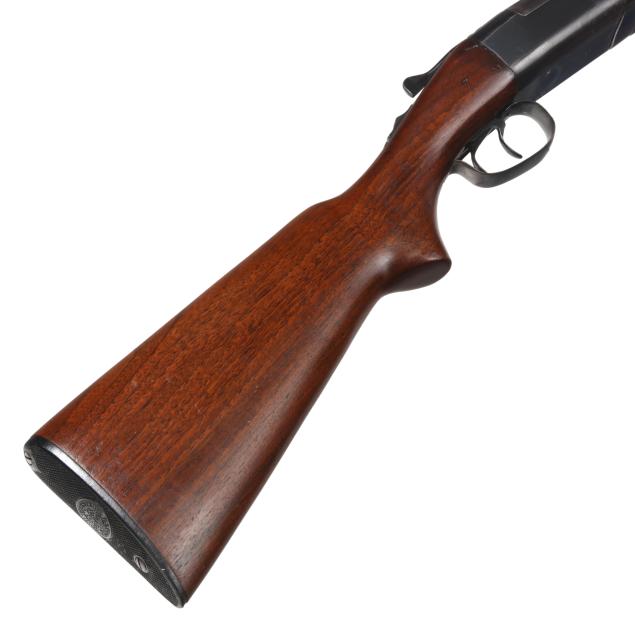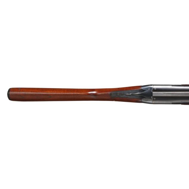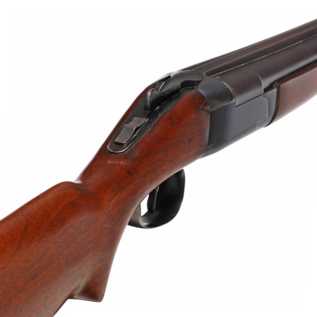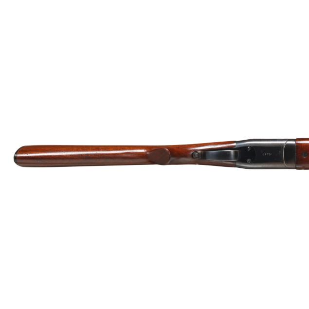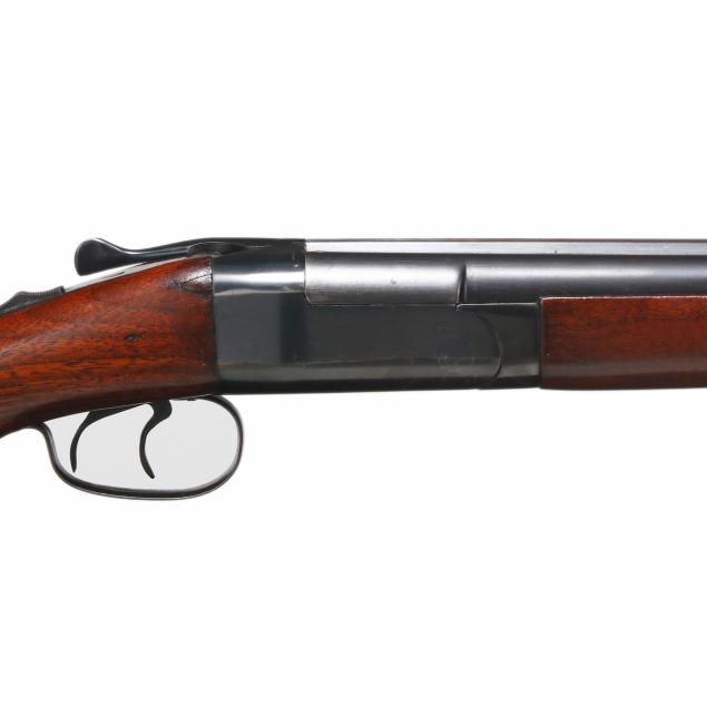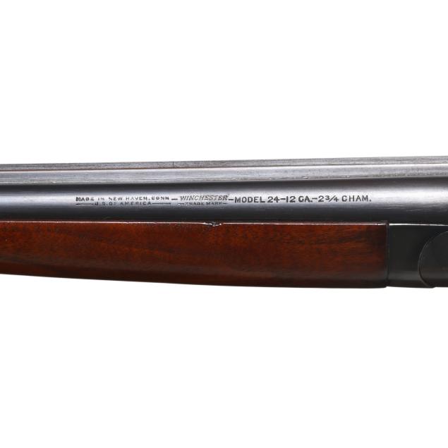 Serial number 71297 present on belly of action, text of WINCHESTER MODEL 24 - 12GA - 2 3/4" CHAM., text of MODIFIED adorns underside of right barrel, text of FULL adorns underside of right barrel, extractors, double triggers, automatic safety, smooth watnut buttstock with pistol grip, smooth beavertail walnut forend, factory buttplate.
