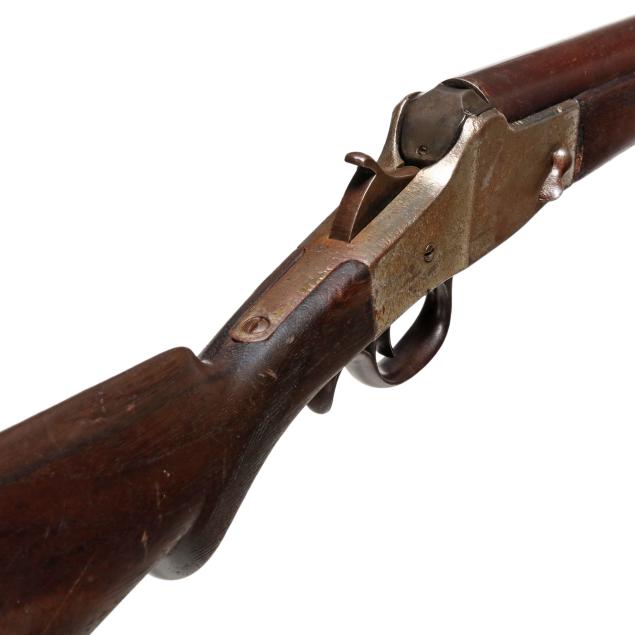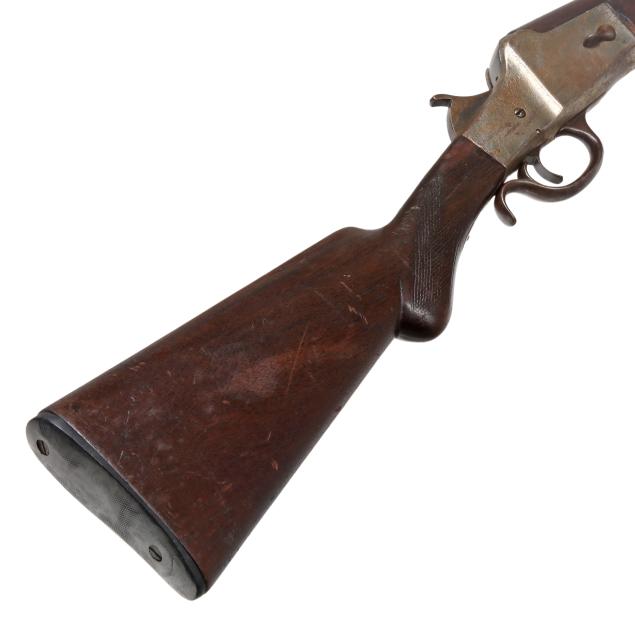No visible serial number (NVS) found on take-down falling block single shot shotgun action, text of COLUMBIA ARM BALTIMORE MD U.S.A. present on 32 in. steel barrel, take-down pin, lever falling block, checkered walnut stock and forend, buttplate.
