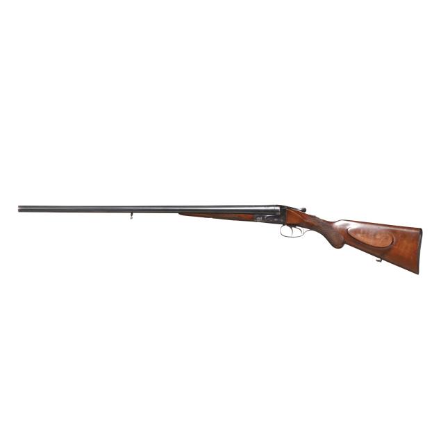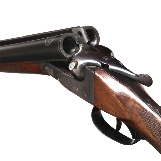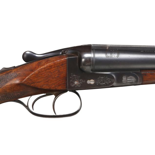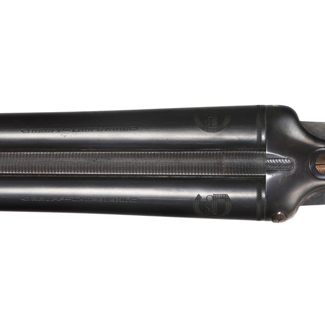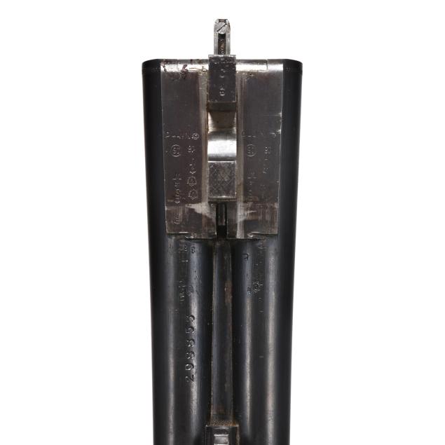 Serial number 298853 present on water table, barrel and forend iron of blued boxlock action receiver, text of KRUPP LAUFSTAHL present on 28 3/8 in. fluid steel barrel with mattered top rib and single bead, GECO insignia present on barrels, GREENER cross-bolt third fastener, double triggers, automatic safety, sling loops, checkered walnut buttstock with Prince Of Wales grip, checkered walnut splinter forend, checkered factory buttplate.