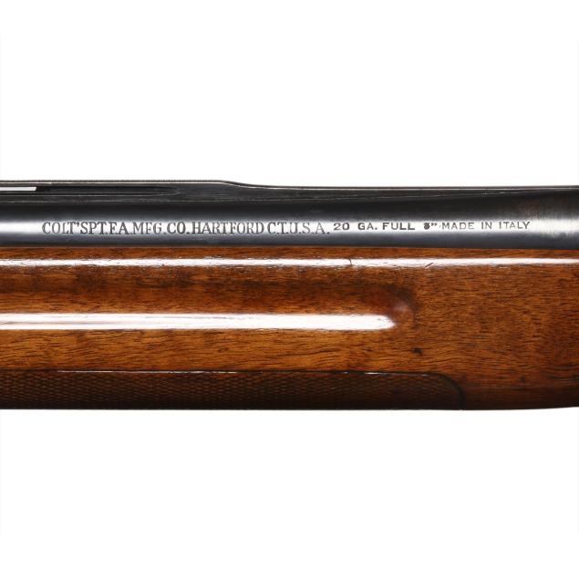 Serial number C070402 present on underside of anodized aluminum semi-automatic receiver, text of COLT'S P.T.F.A. MFG. HARTFORD CT. U.S.A. MADE IN ITALY present on left side of receiver, text of 20GA. FULL 3" MADE IN ITALY present on 28 in. blued steel vent rib barrel with single bead, manual safety, press checkered walnut buttstock and forend, aftermarket recoil pad.