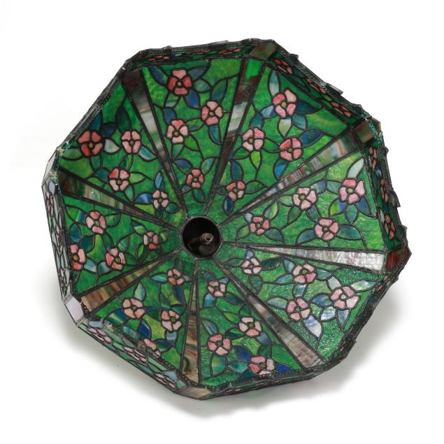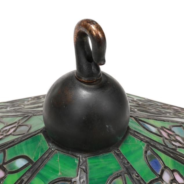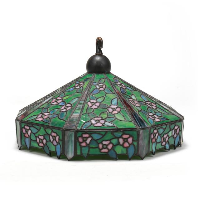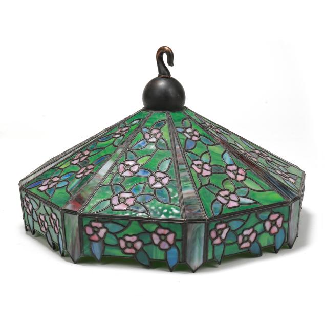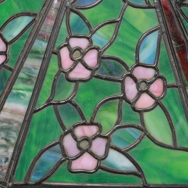 Circa 1925, manner of Chicago Mosaic, unsigned, octagonal paneled form with pink blossoms on a mottled green to blue field, separated by tapering corner registers, patinated bronze or brass orb and hook hanger.