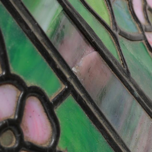 Several glass panels with cracks, some with glued repair; areas of loss to came and interior chain trim, with some soldered repairs; without lighting fixture.