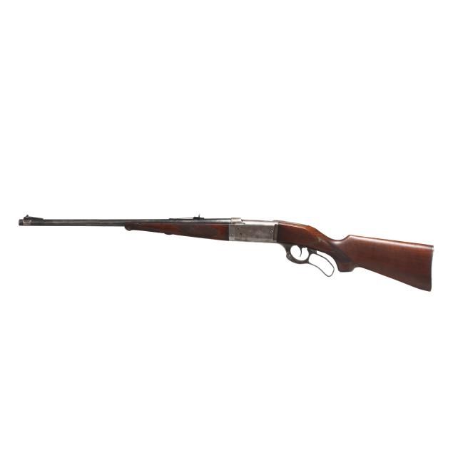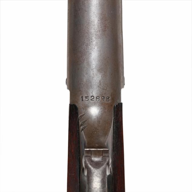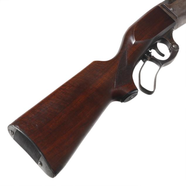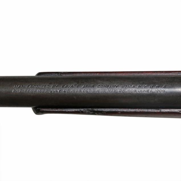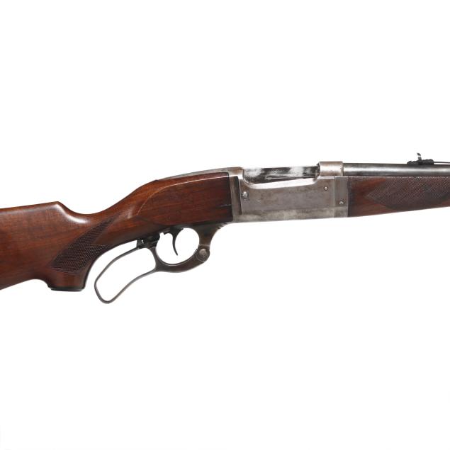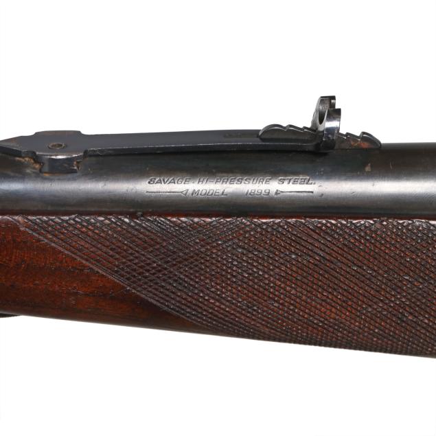 Serial number 152898 present on underside of lever-action receiver, text of SAVAGE HI-PRESSURE STEEL .30-30 present on 22 in. blued steel barrel, dovertail rear sight with elevator, dovetail front sight on a ramped base with barrel band, takedown variant receiver, brass round count indicator, cocking indicator, checkered walnut buttstock and forend, capped pistol grip, lined steel buttplate.