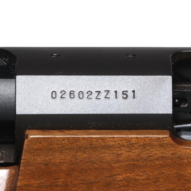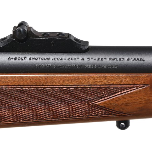 Serial number 02602ZZ151 present on right side of bolt-action receiver, text of A-BOLT SHOTGUN 12GA 2 3/4" & 3" - 22" RIFLED BARREL SABOT AMMUNITION RECOMMENDED present on 22 in. barrel, screw attached adjustable rear sight, screw attached fiber optic front sight, detachable box magazine, manual safety, checkered walnut stock, cling swivels, factory recoil pad.