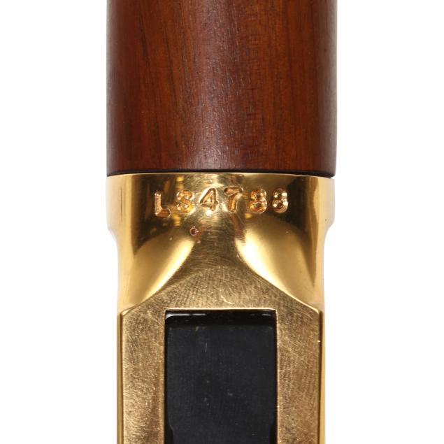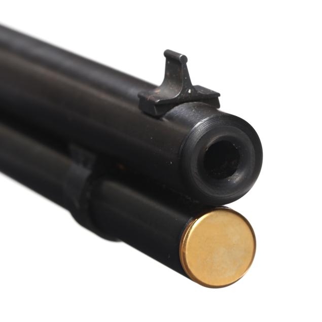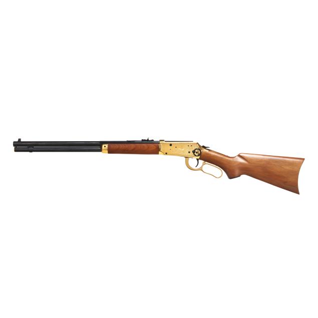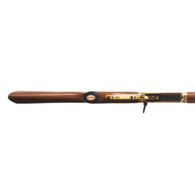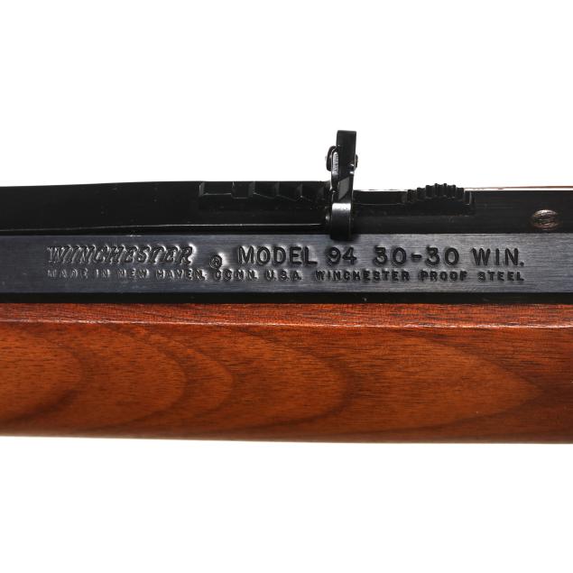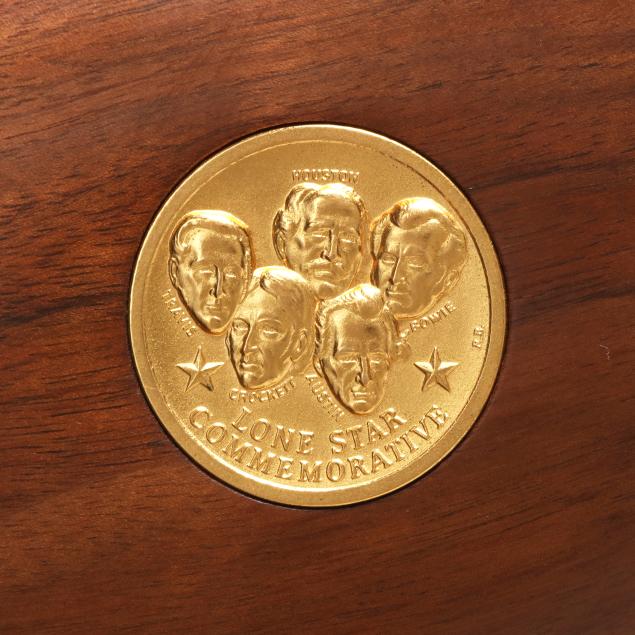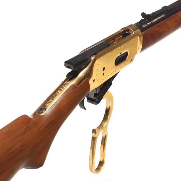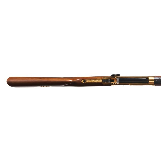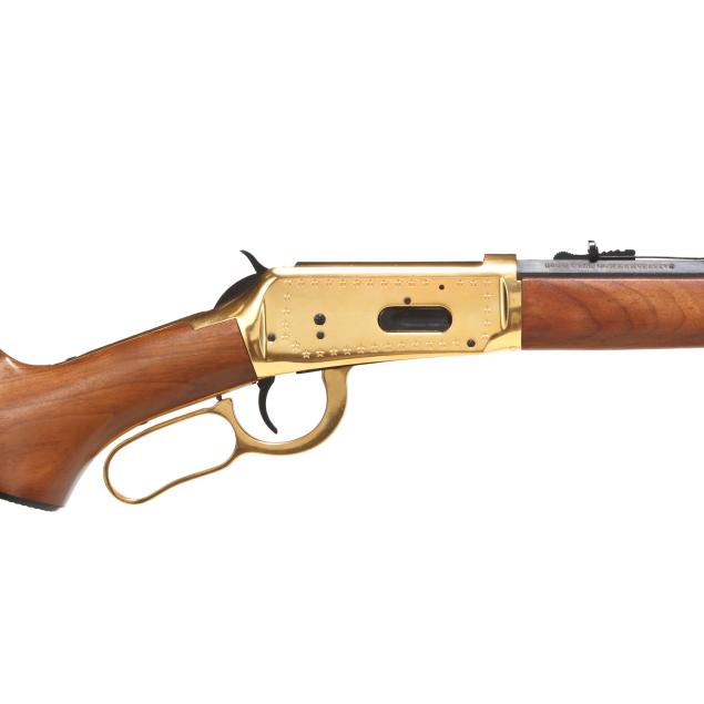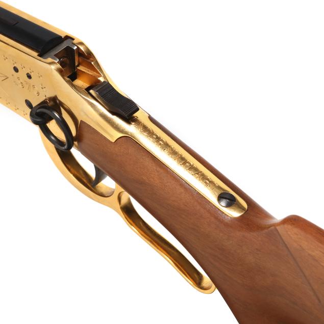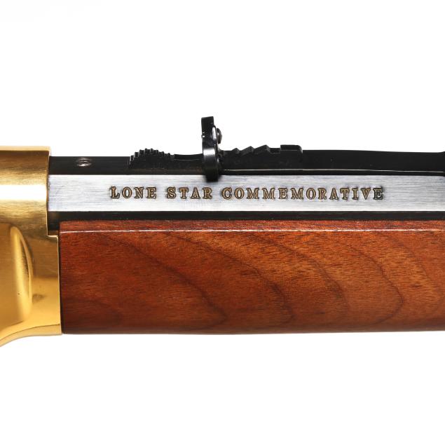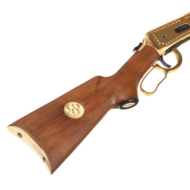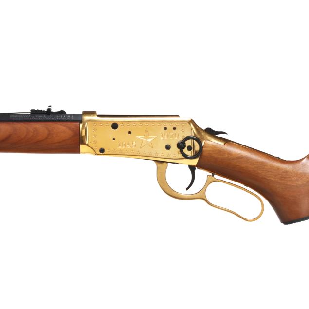 Serial number LS4788 present on underside of gold colored lever-action receiver, numerals 1845 and 1970 engraved on left side of receiver accompanied by stars on right and left sides, text of UNDER SIX FLAGS engraved on receiver top tang, text of LONE STAR COMMEMORATIVE and MODEL 94 .30-30 WIN. present on 20 in. half-round blued steel barrel, dovertail rear sight with elevator, dovetail front sight, full length magazine tube, gold colored lever, forend cap, buttplate and magazine tube cap, blued hammer, trigger and saddle ring, smooth walnut stock and forend, pistol grip cap inscribed WINCHESTER REPEATING ARMS and TEXAS, gold colored coin inlaid in buttstock illustrating the faces and names of HOUSTON, TRAVIS, CROCKETT, AUSTIN, BOWIE.