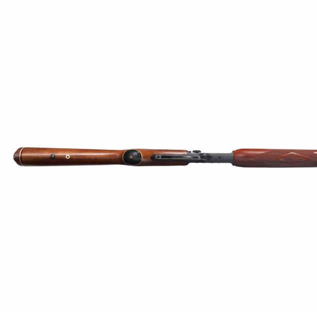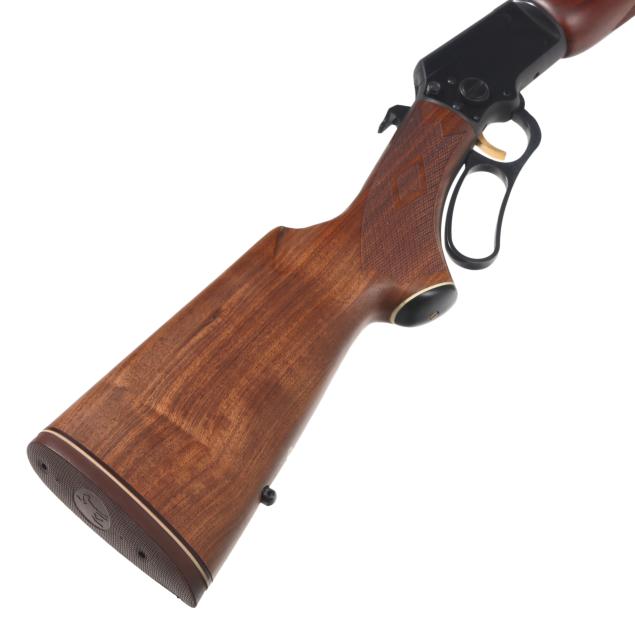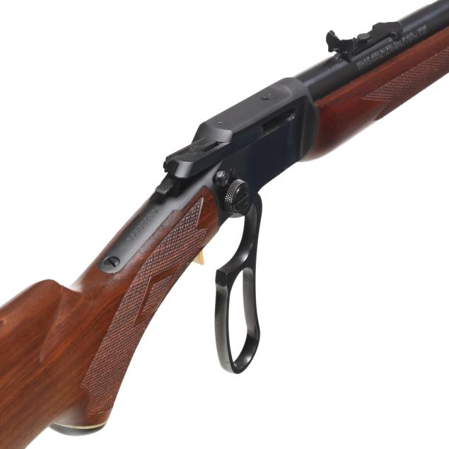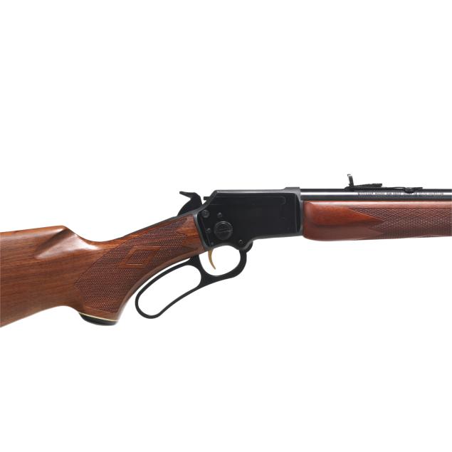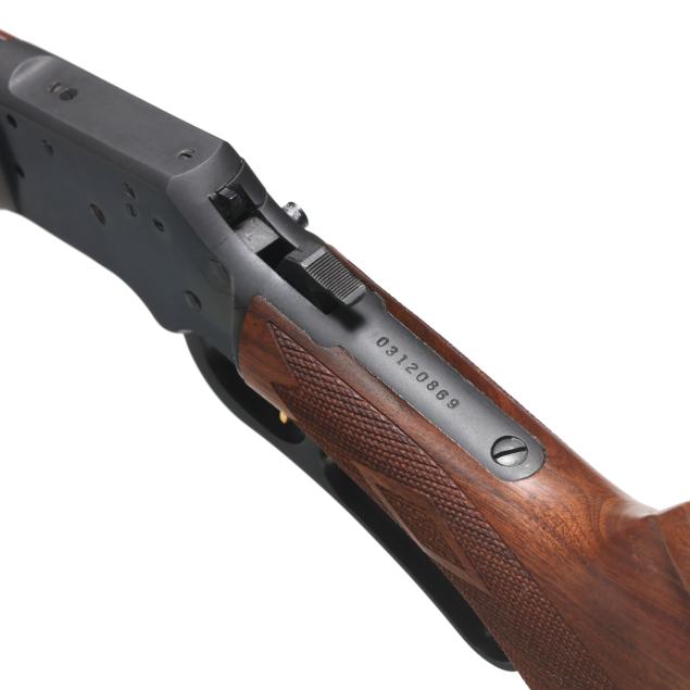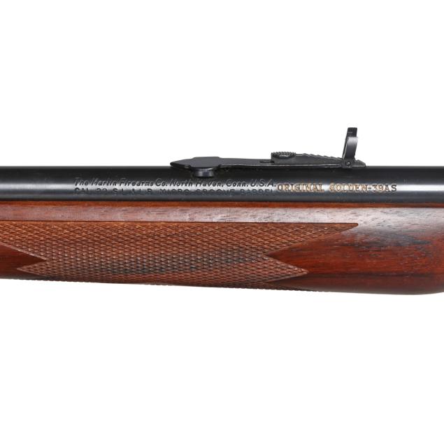 Serial number 03120869 present on blued lever-action receiver top tang, text of THE MARLING FIREARMS CO. NORTH HAVEN, CONN. U.S.A. and ORIGINAL GOLDEN 39AS present on 24 in. blued steel barrel, full length magazine tube, dovetail rear sight with elevator, screw attached ramped front sight with hood, gold colred trigger, blued forend cap, level and hammer, checkered walnut buttstock and forend with capped pistol grip, sling studs.