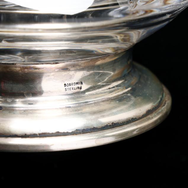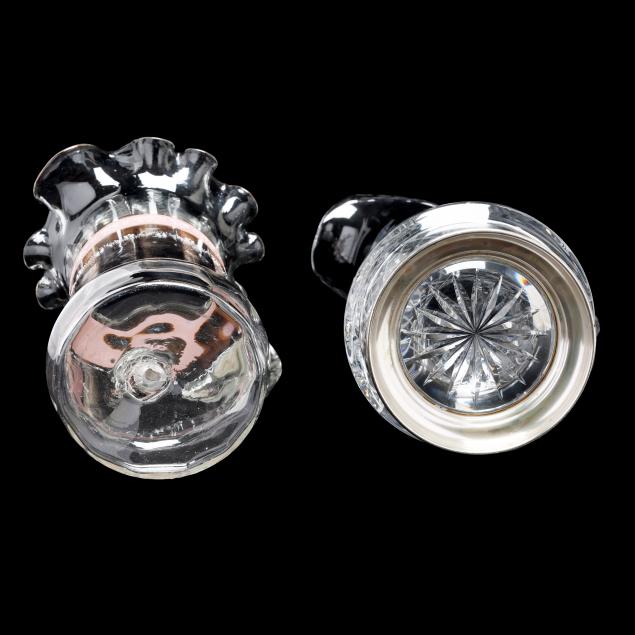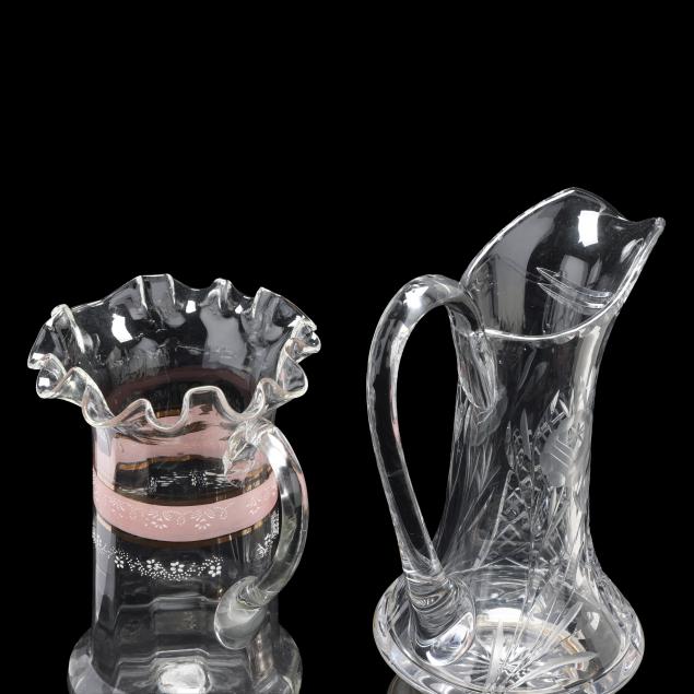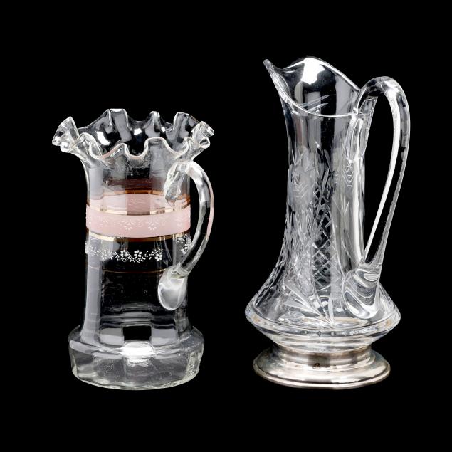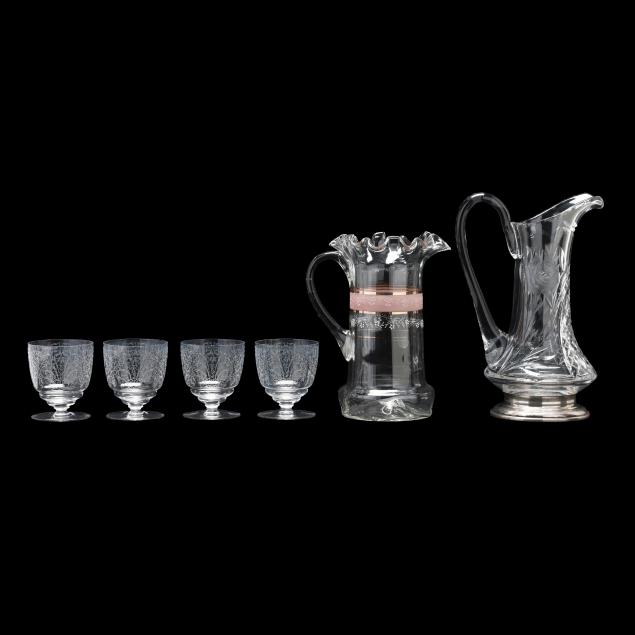 Including (4) etched Baccarat glasses (3.75 in.); a vintage cut glass pitcher with sterling silver foot, marked "Boardman Sterling" (11.5 in.); and a late-19th-century blown glass pitcher with hand enameled and gilt highlights (9.5 in.).