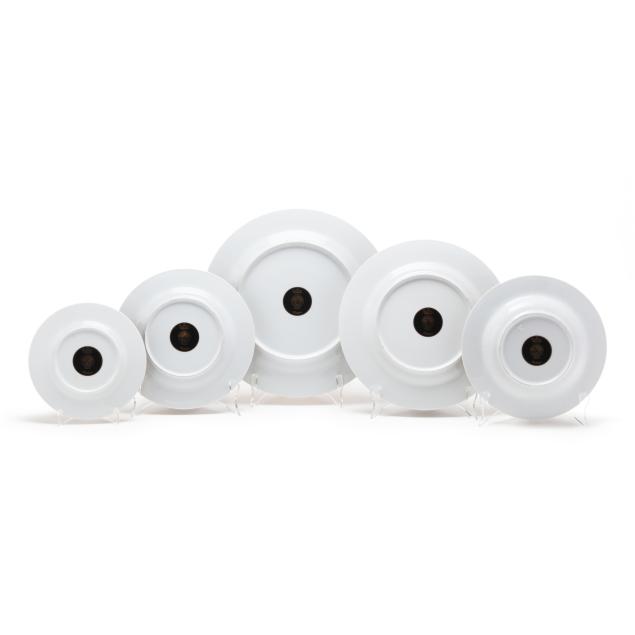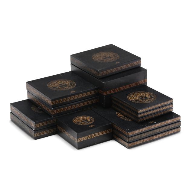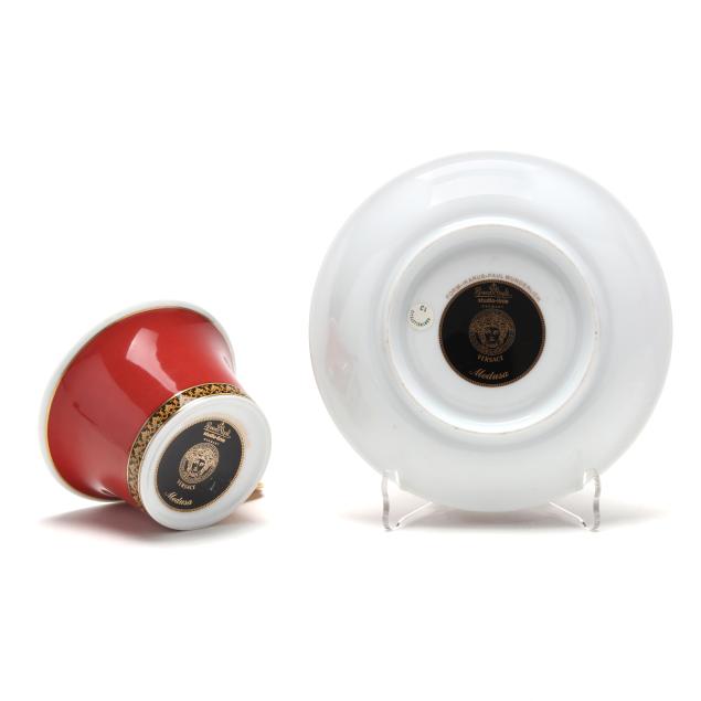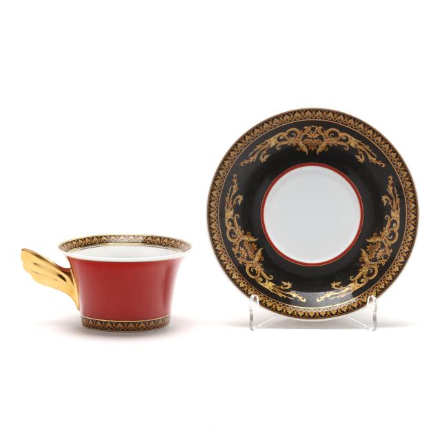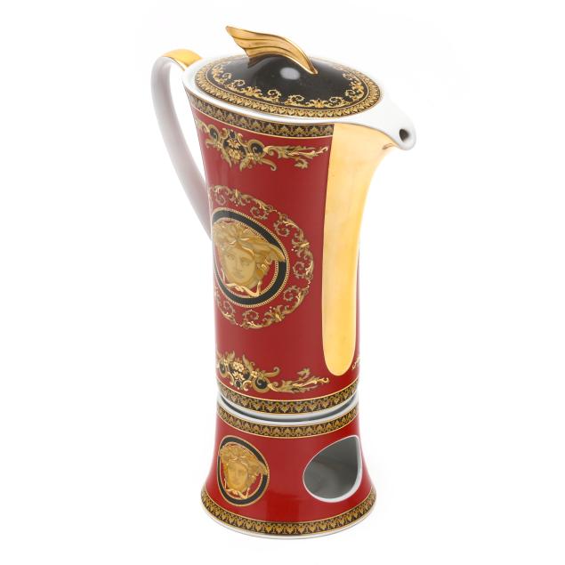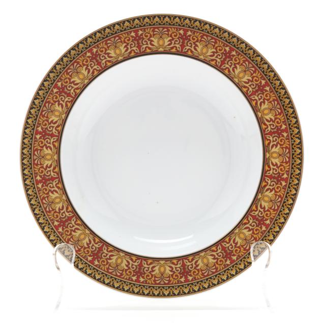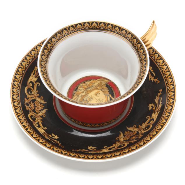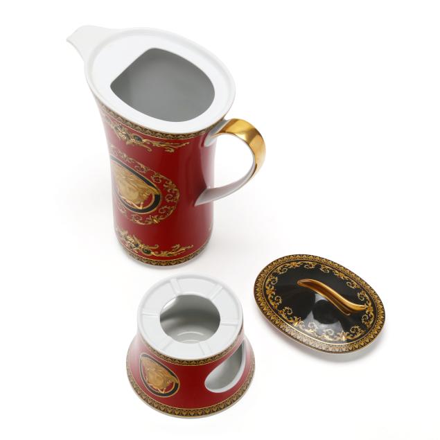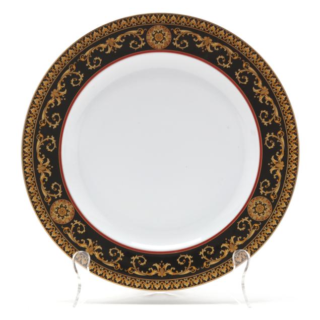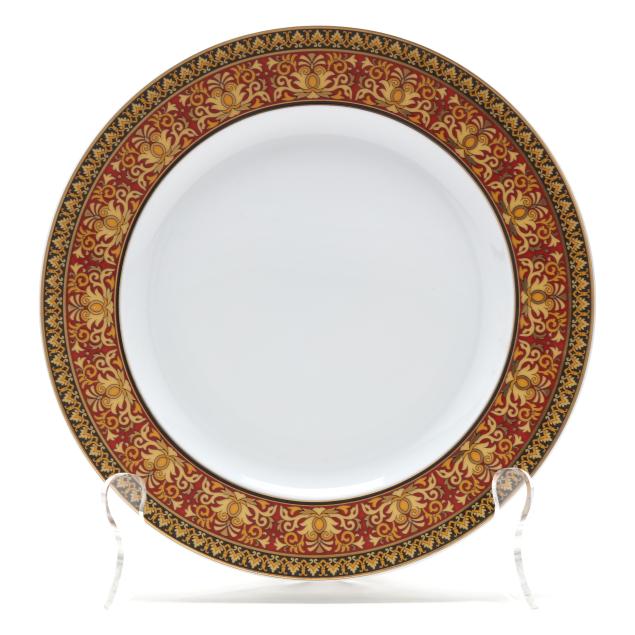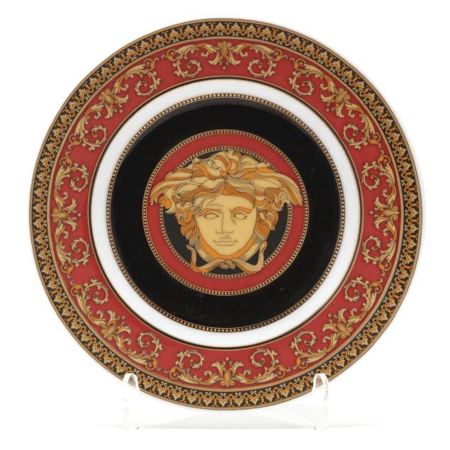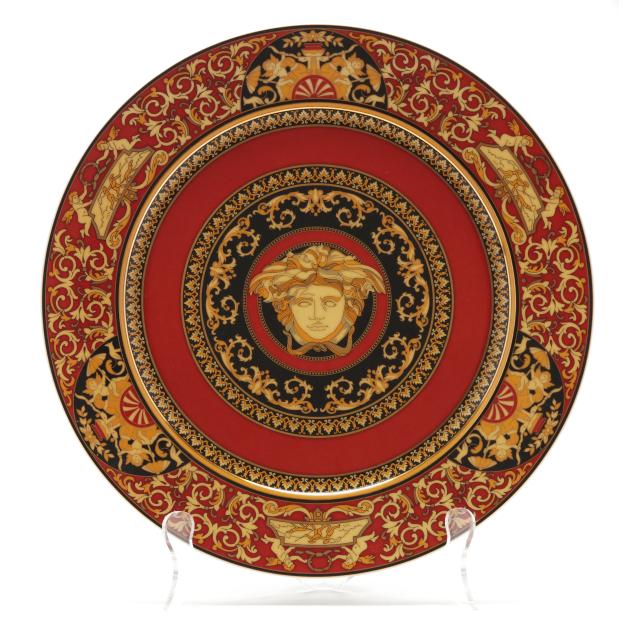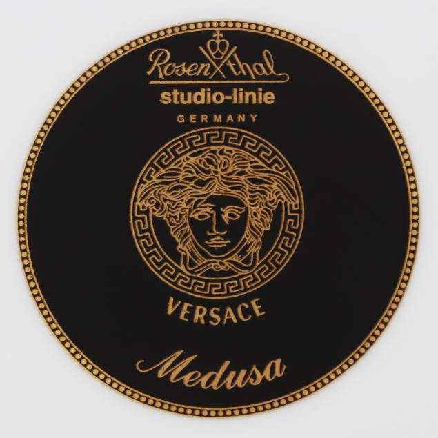 (22) pieces, made in Germany, designed by Versace, all with company backstamps and original boxes, comprising (3) chargers/wall plates (12 1/8 in.); (3) dinner plates (10 3/4 in.); (3) salad plates (8 3/4 in.); (2) large rim soup bowls (8 7/8 in.); (3) bread and butter plates (7 1/4 in.); lidded coffee pot (9 3/4 in.) and warming stand (3 in.); (3) cups (2 3/8 in.) and (3) saucers (6 1/4 in.).