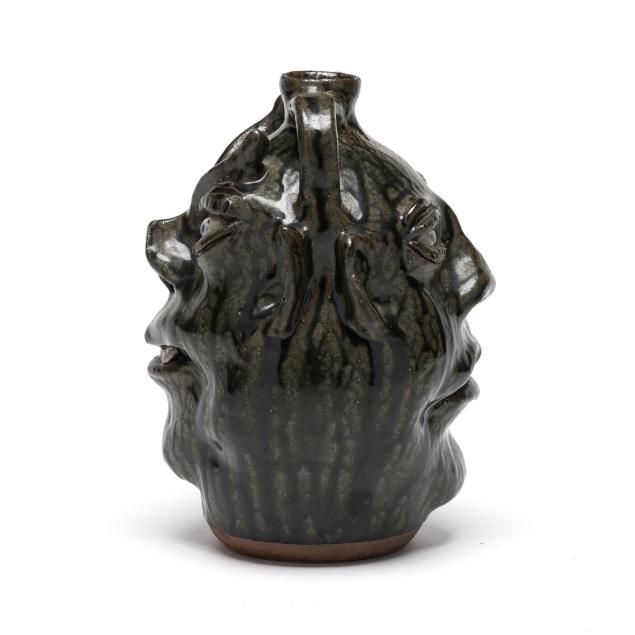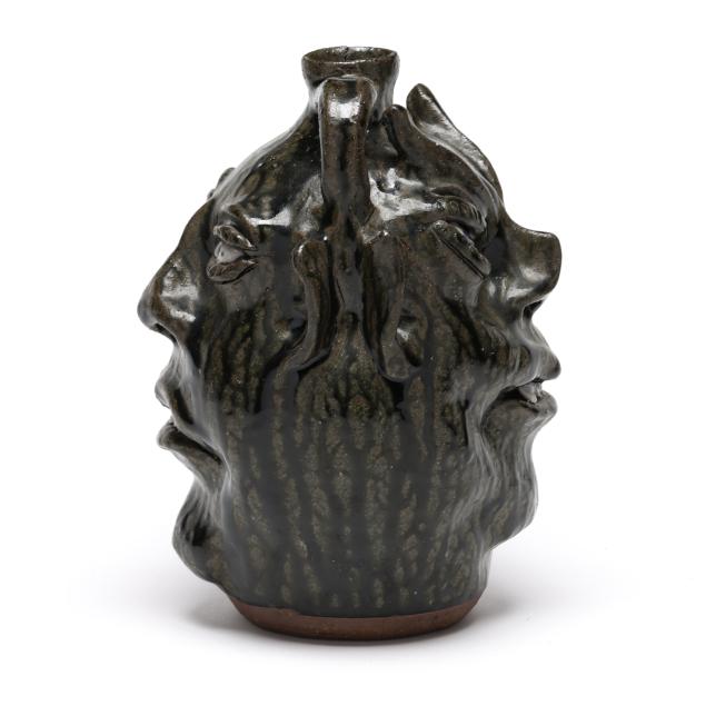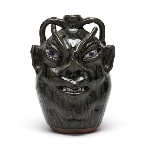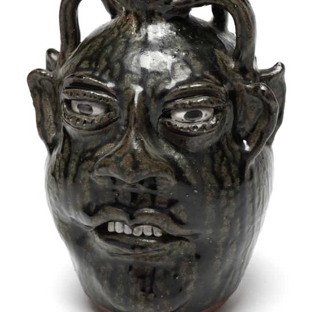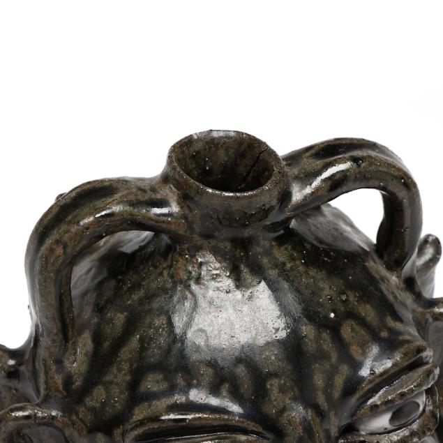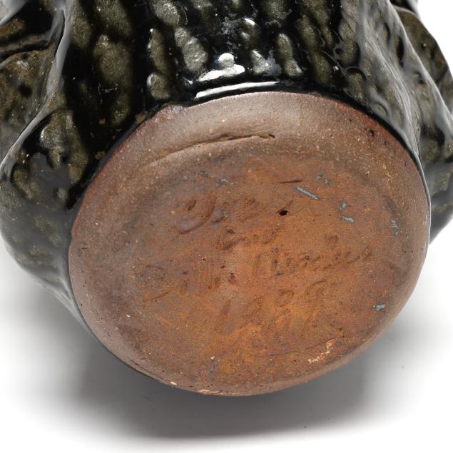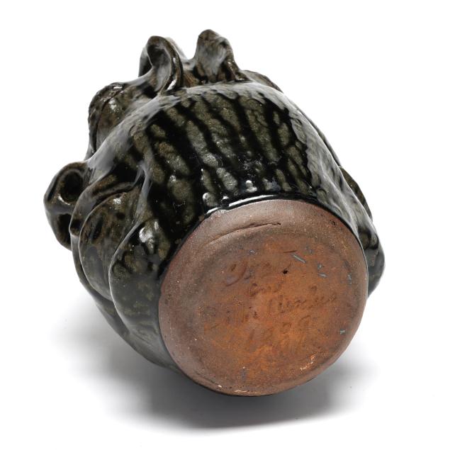 1989, White County, Georgia, tobacco spit glazed stoneware jug with applied handles and features, inscribed "Cleater / and / Billie Meaders / 1989" to underside.