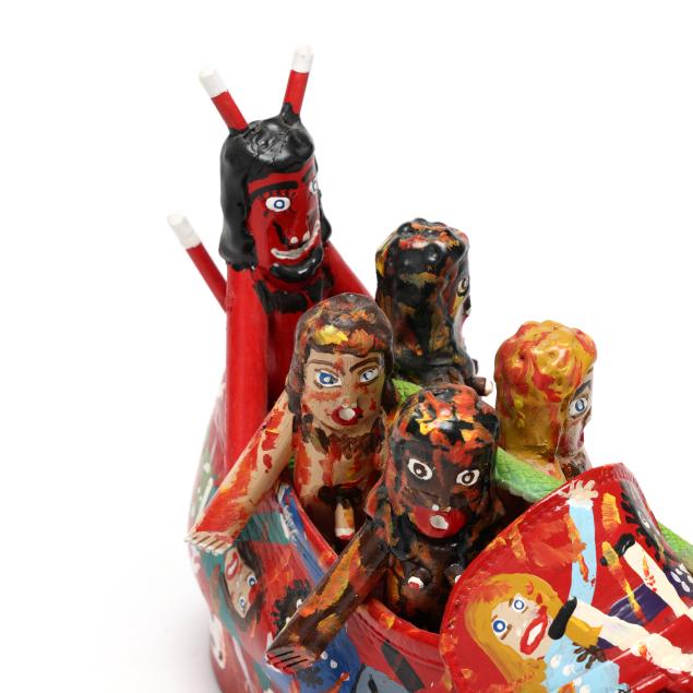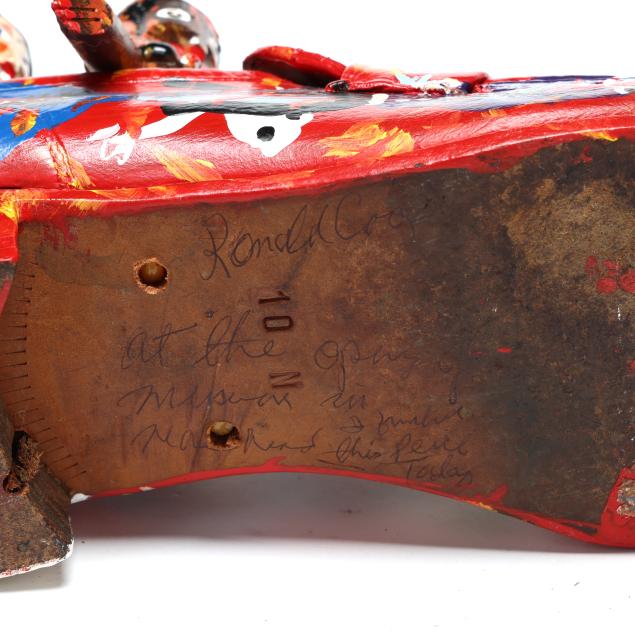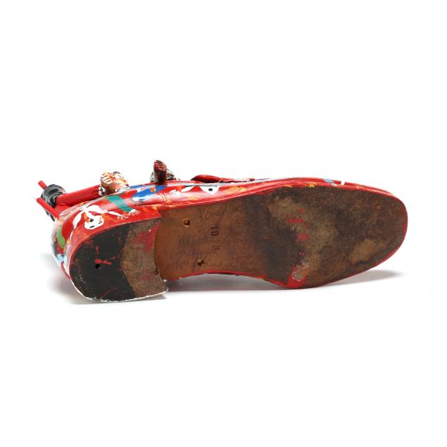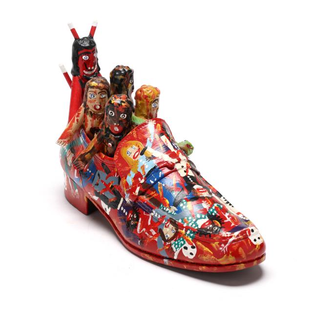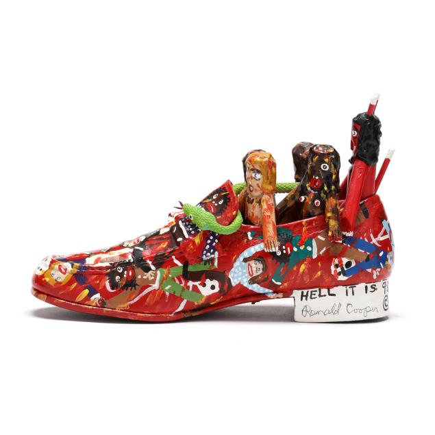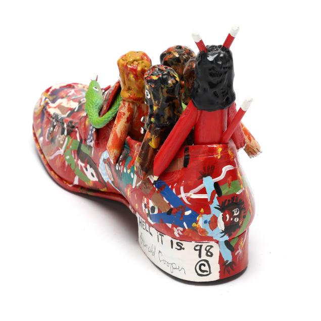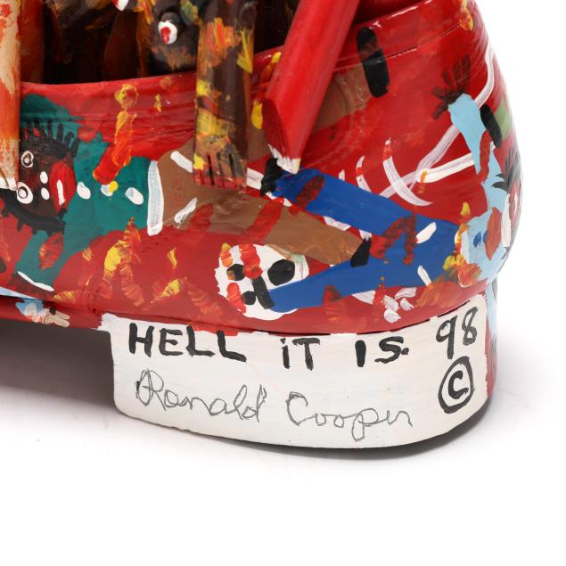 1998, polychrome painted men's dress shoe with (6) wooden figures including a devil figure mounted to footbed, applied rubber snake wrapping around figures, marked "HELL iT is. 98 / Ronald Cooper ©" to shoe heel, inscribed "Ronald Cooper / At the opening of the / Museum in / Ma-h--d I finished / this peice / Today" to underside.