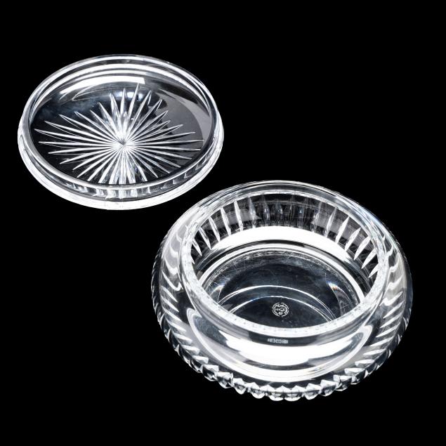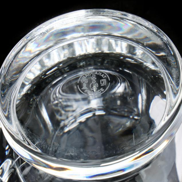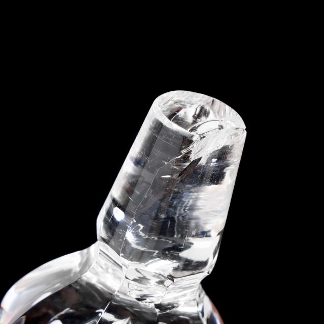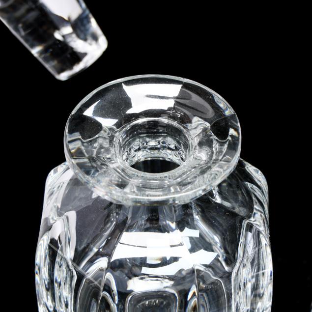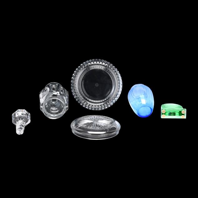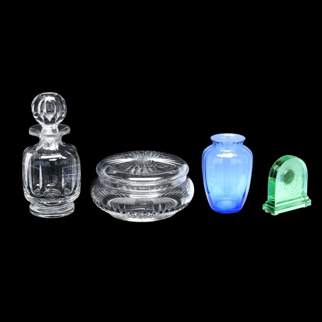 France, mid- to late 20th century, including a light blue vase (4.25 in.); a green art deco style floral decorated clock (3 in.); faceted bottle with stopper (7 in.); and a star cut pattern lidded dresser box (3 x 6 in. diameter), signed.