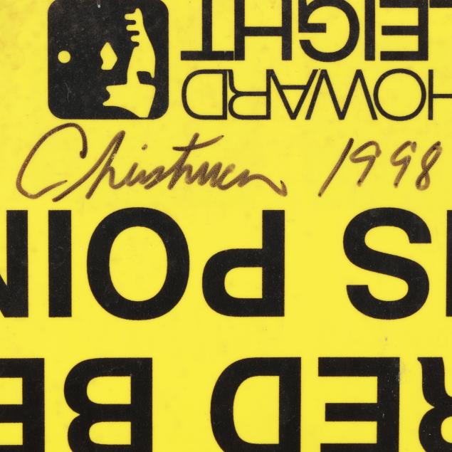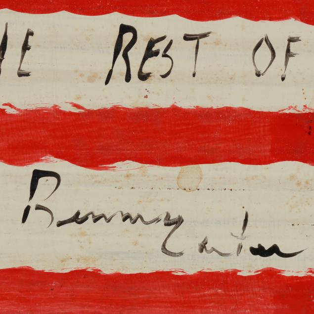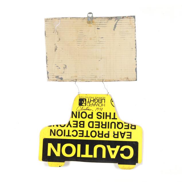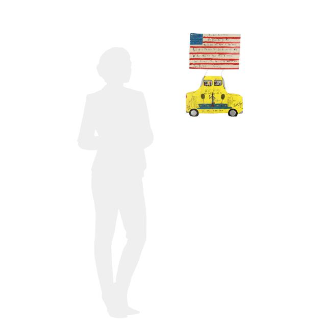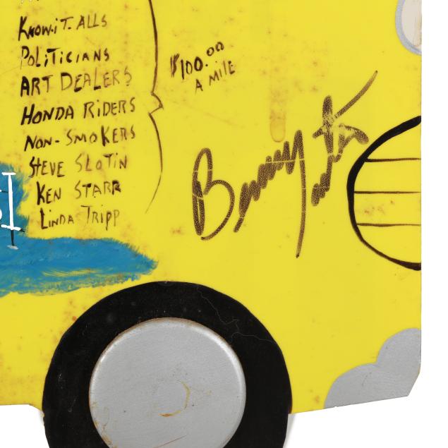 1998, hand-painted and assembled construction about "Slick Willie" and his taxi cab company in New York City, the top portion depicting an American flag on ribbed tin with inscription about Slick Willie; the lower portion made with repurposed plastic construction caution sign in the form of Slick Willie's taxi cab, inscribed "To Bill Jones" on lower left portion and signed by the artist to lower right, the verso dated "Christmas 1998."