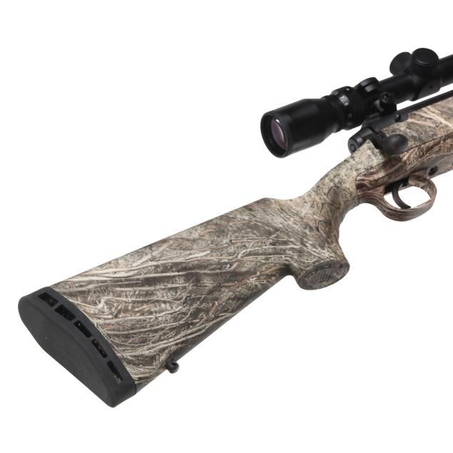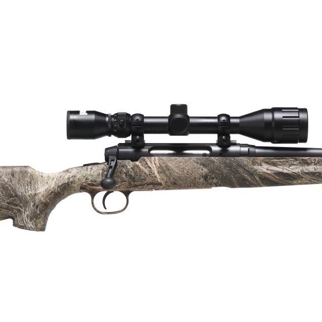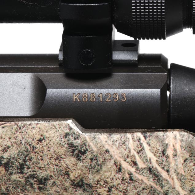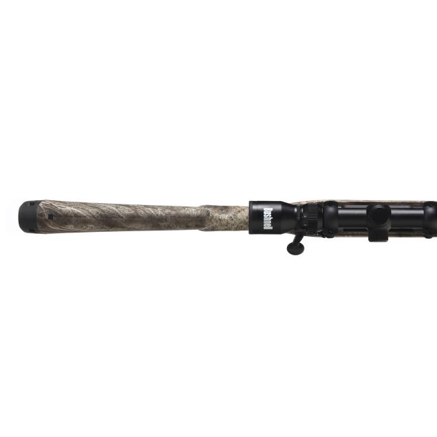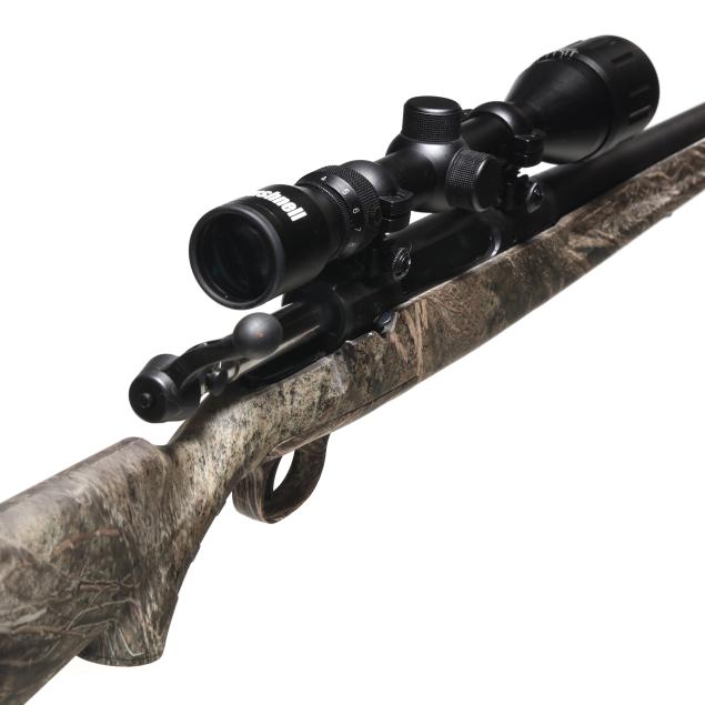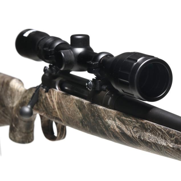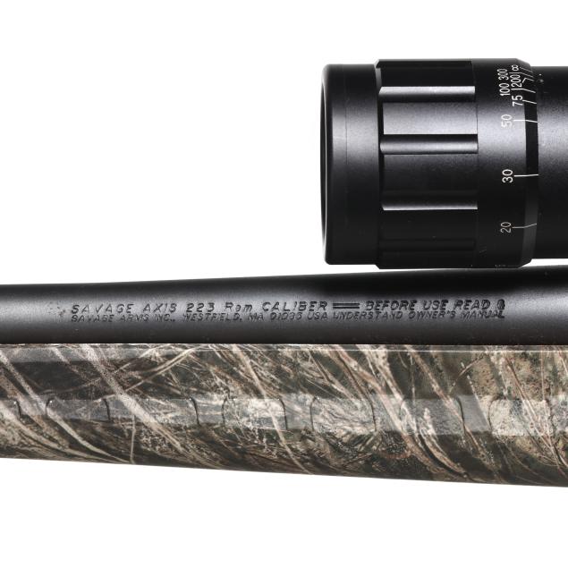 Serial number K881293 present on blued bolt-action receiver, text of SAVAGE AXIS 223 REM. present on 22 in. blued steel barrel, two piece WEAVER scope bases, scope rings, BUSHNELL 4-12 with 10yds to infinity objective adjustment, bikini scope cover, manual safety, sling studs, detachable box magazine, camo hydro-dipped composite stock. factory recoil pad.