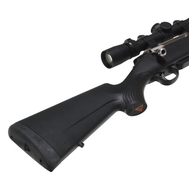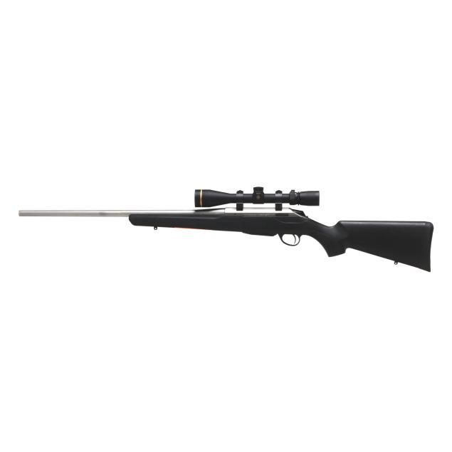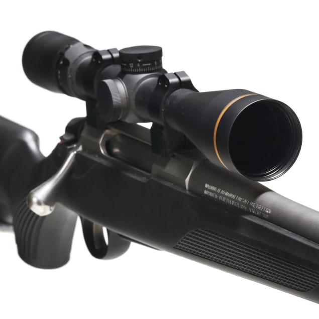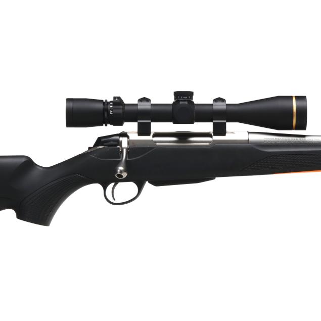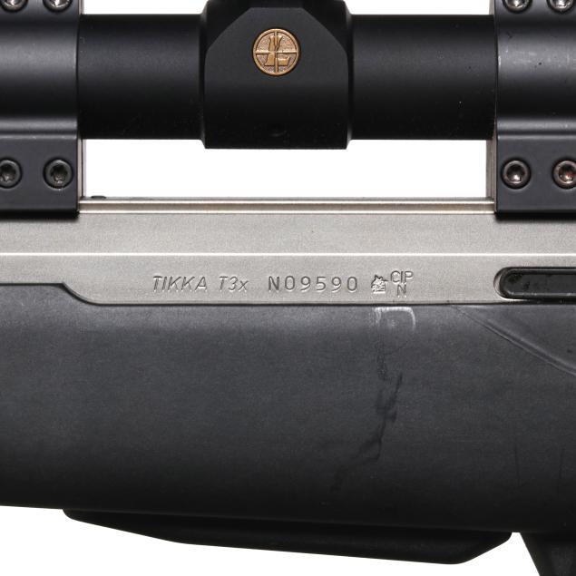 Serial number N09590 present on left side of brushed stainless steel bolt-action receiver, text of CAL. .30-6 SPRG. MADE IN FINLAND, present on 22 in. brushed stainless steel barrel, TALLEY scope rings, LEUPOLD VX-3i 3-10x40mm scope with cover, manual safety, detachable box magazine, sling studs, composite stock, factory recoil pad.