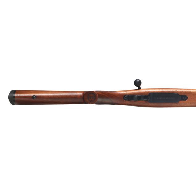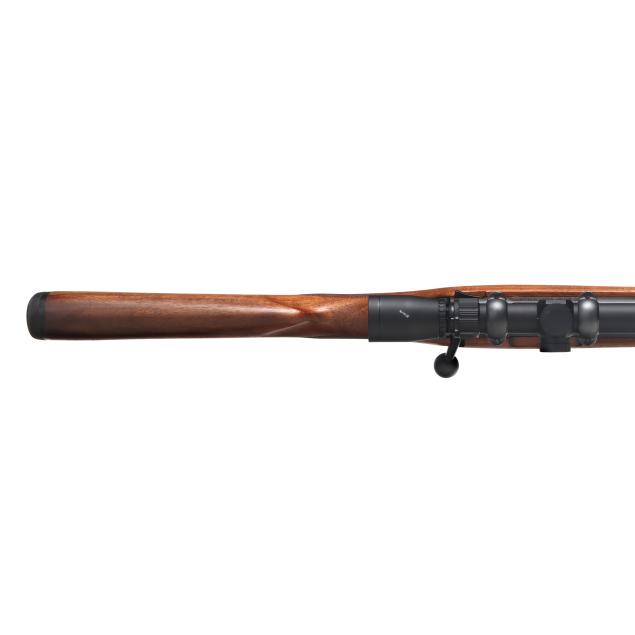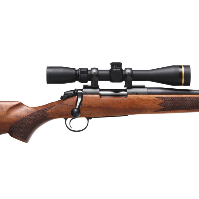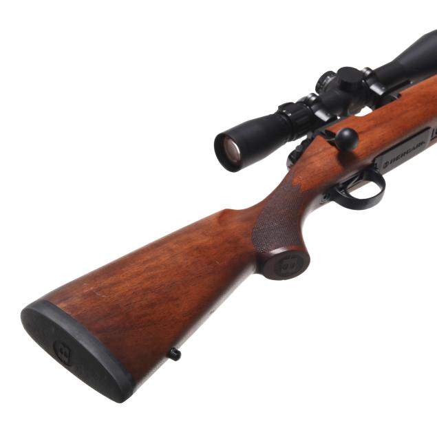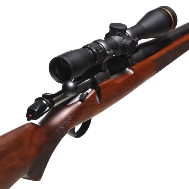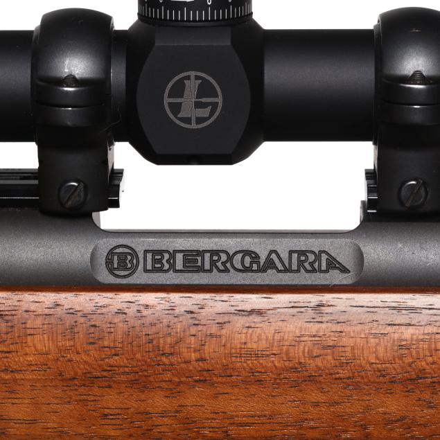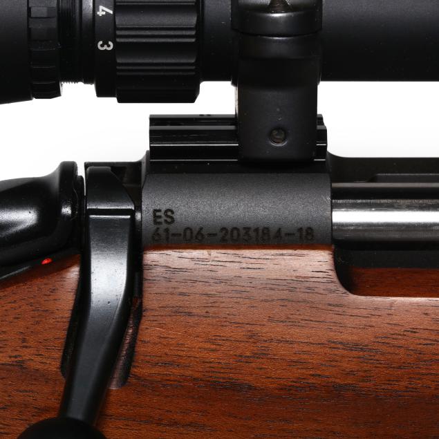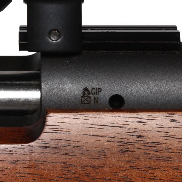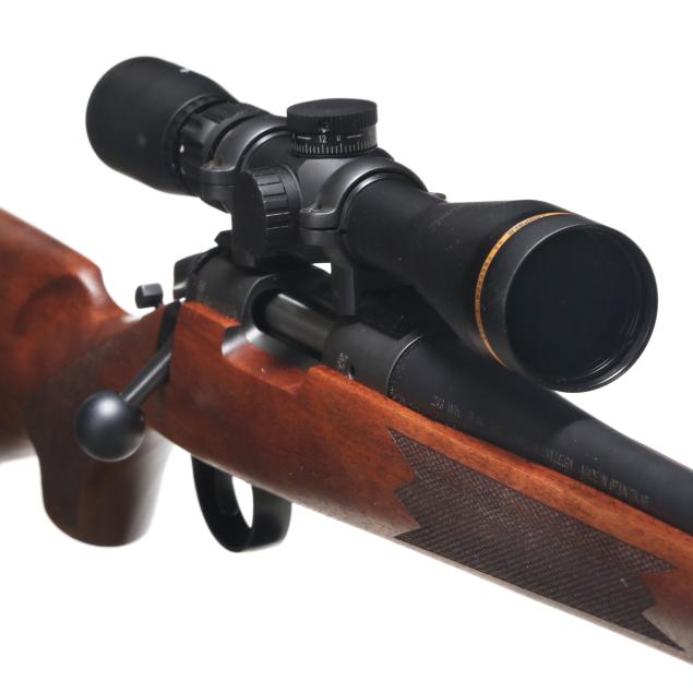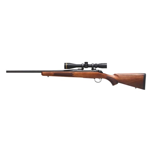 Serial number ES 61-06-203184-18 present on right side of blued bolt-action receiver, text of .243 WIN. B-14 BPF LAWRENCEVILLE, GA MADE IN SPAIN/DIKAR present on blued steel barrel, WEAVER two piece scope bases, LEUPOLD scope rings, LEUPOLD XX-FREEDOM 3-9X40MM scope, manual safety, sling studs, checkered walnut stock, factory buttplate.