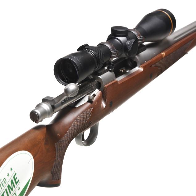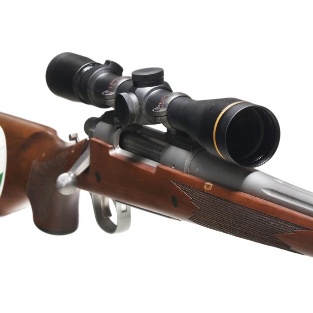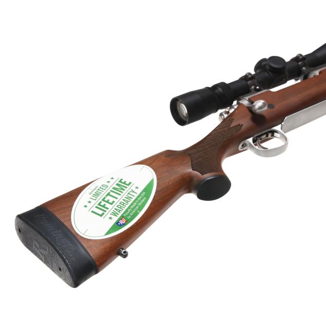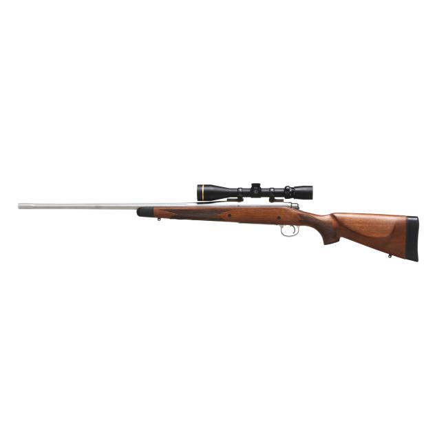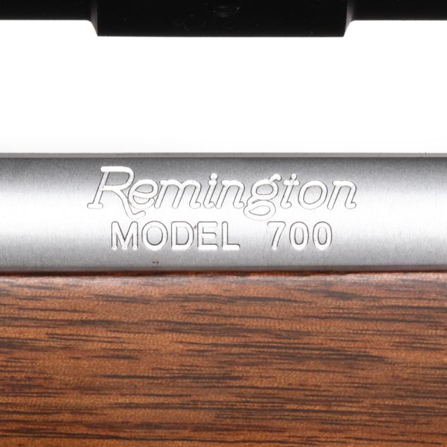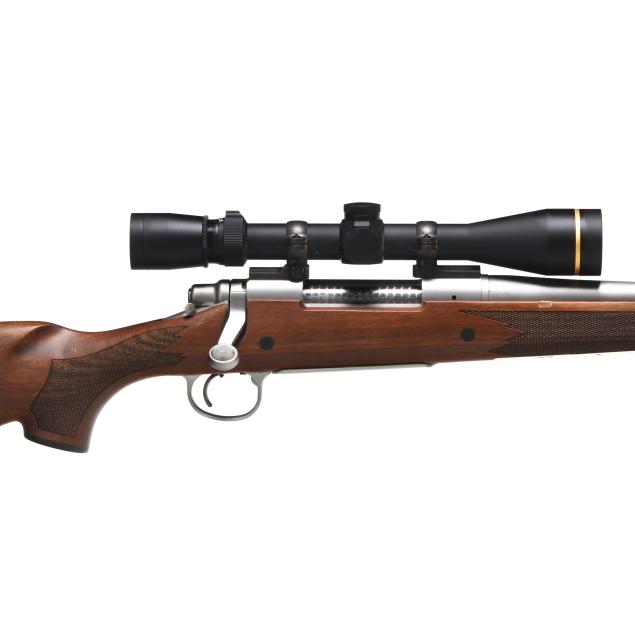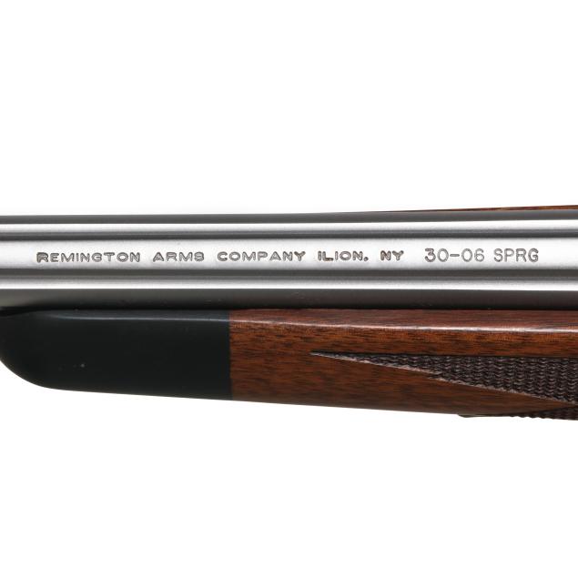 Serial number RR25796L present on left side of brushed stainless bolt-action receiver, 24 in. text of REMINGTON ARMS COMPANY ILION, N.Y. .30-06 SPRG present on fluted brushed stainless steel barrel, brushed stainless steel bottom metal, jeweled bolt, LEUPOLD two-piece scope bases with LEUPOLD rings, LEUPOLD VX-3i 4.5-14x40mm scope