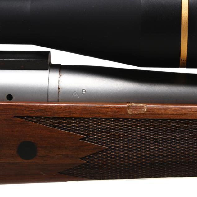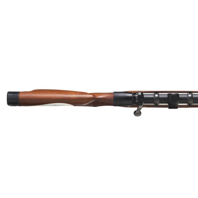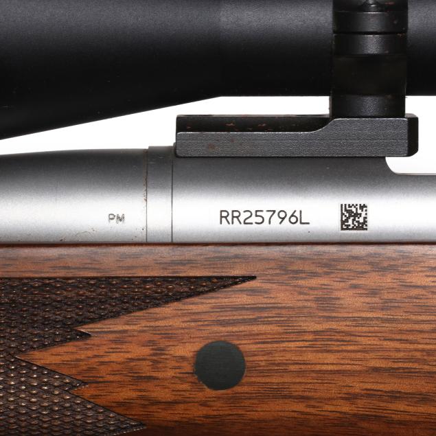 Overall excellent estate condition, firearm presents as like-new, bright and shiny bore, some evidence of safe damage from collision with other firearms on the upper right side of forend and right checkering panel at the wrist, scattered shallow depressions found in few other locations, steel scope rings and bases show light surface rust from humidity, original factory stickers present on buttstock and forend areas.