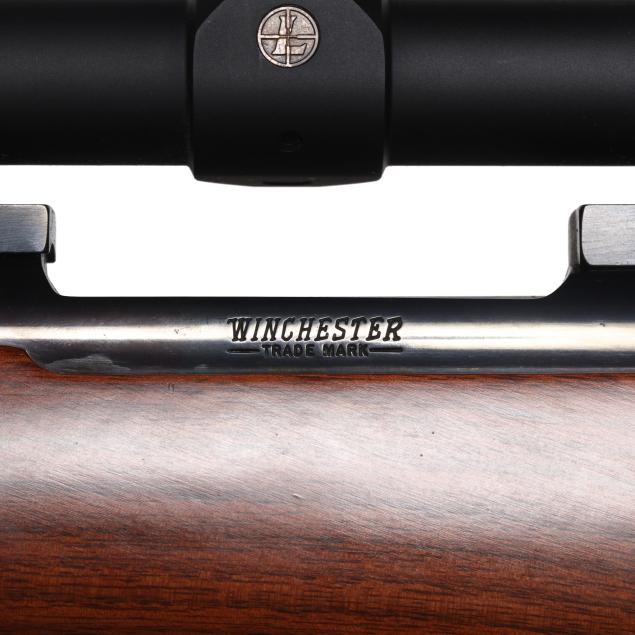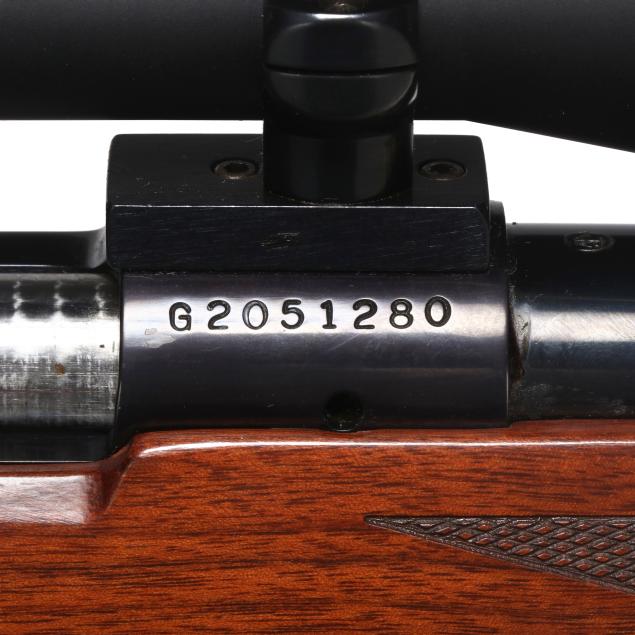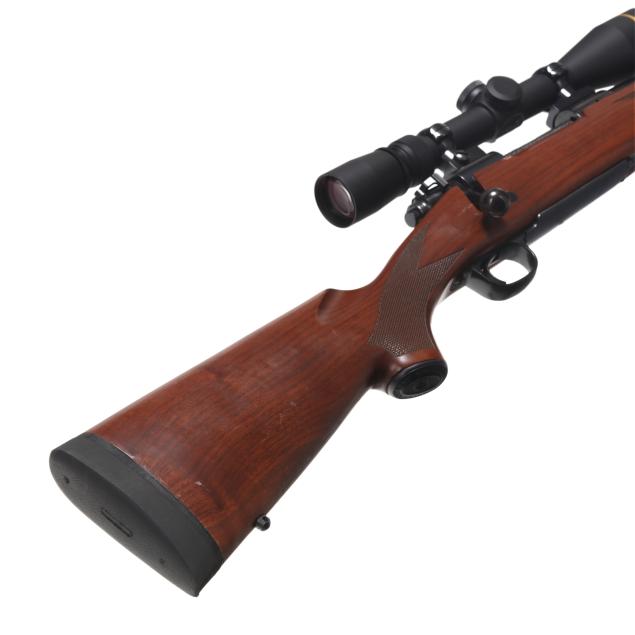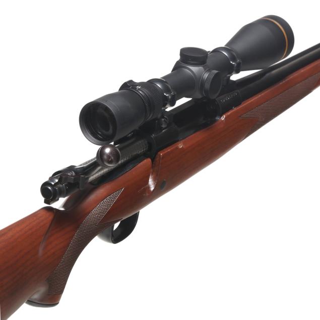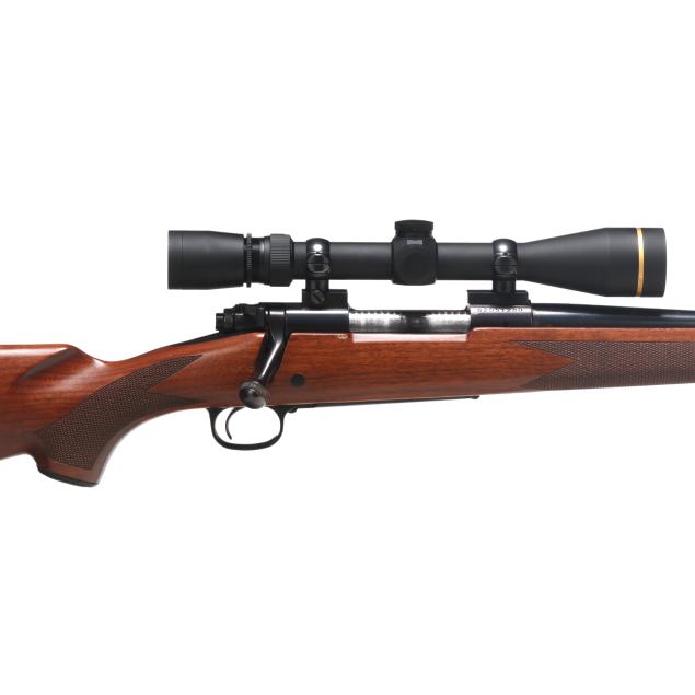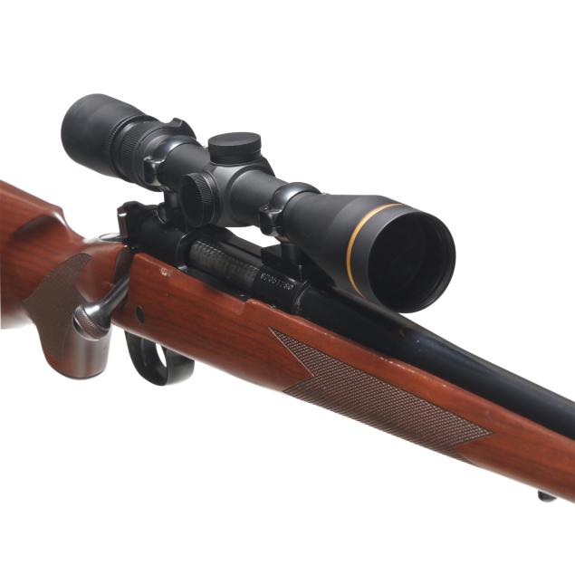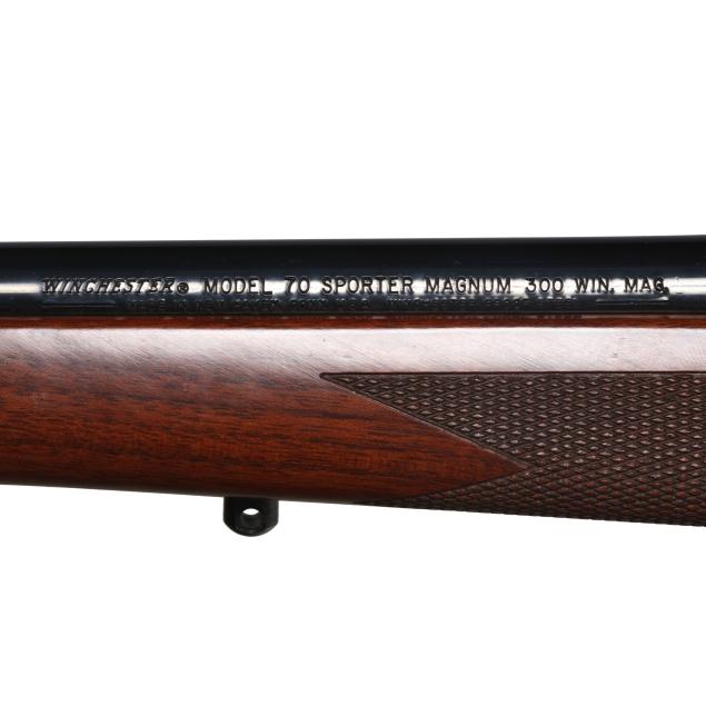 Serial number 2051280 present on right side of blued bolt-action receiver, text of WINCHESTER MODEL 70 SPORTER MAGNUM .300 WIN MAG present on high polish blued 24 in. barrel, two piece scope bases with rings, LEUPOLD VX-3i 3.5-10X40MM scope, manual safety, jeweled bolt, sling studs, checkered walnut stock, capped pistol grip, PACHMAYR DECELERATOR recoil pad.