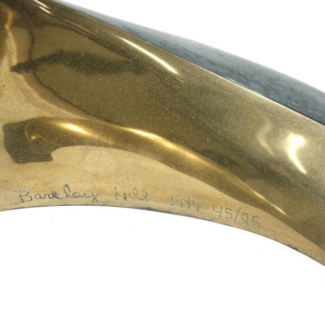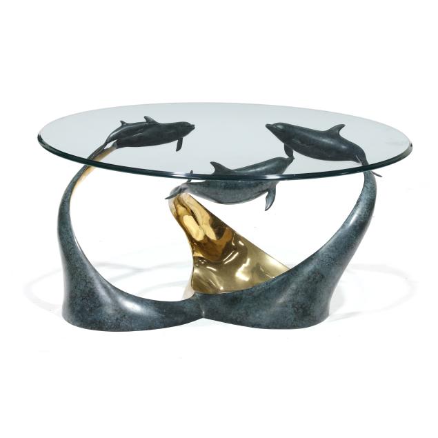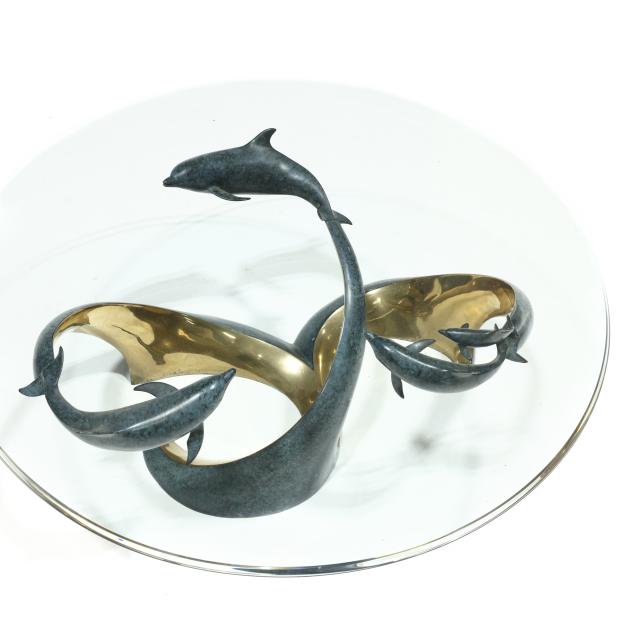 1994, numbered 45/95, glass top set on a polished and patinated bronze base of three swimming dolphins followed by one calf, signed at base interior edge.