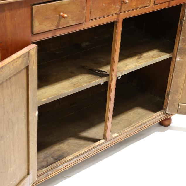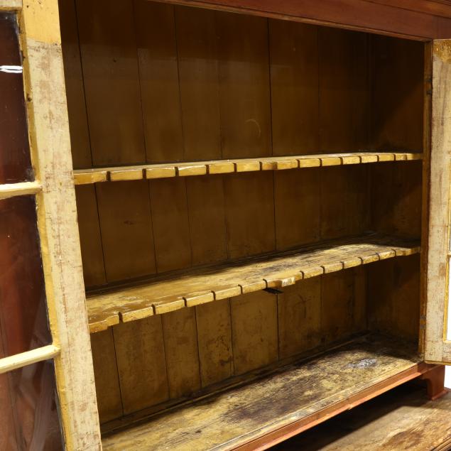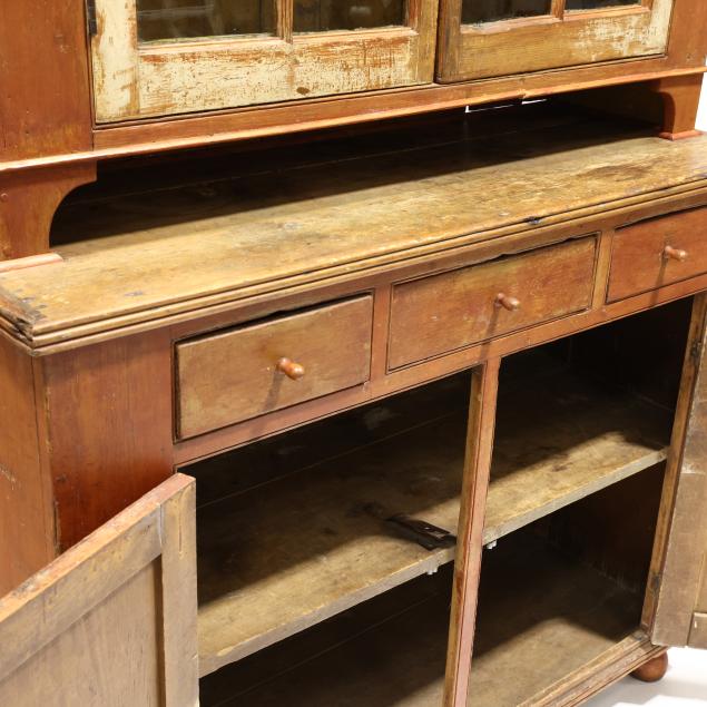 Second half 19th century, white pine primary with white pine and poplar secondary, two part form, dovetailed case with applied flared molded cornice, two hinge doors with six window lights each, shelved interior in yellow paint with utensil notched edges and rear dish grooves, above an open pie shelf, the lower case with applied reeded edge, three drawers with scratch bead surround over two hinged raised panel doors with repeating scratch bead surround, shelved interior, applied reeded base trim, raised on later turned feet.