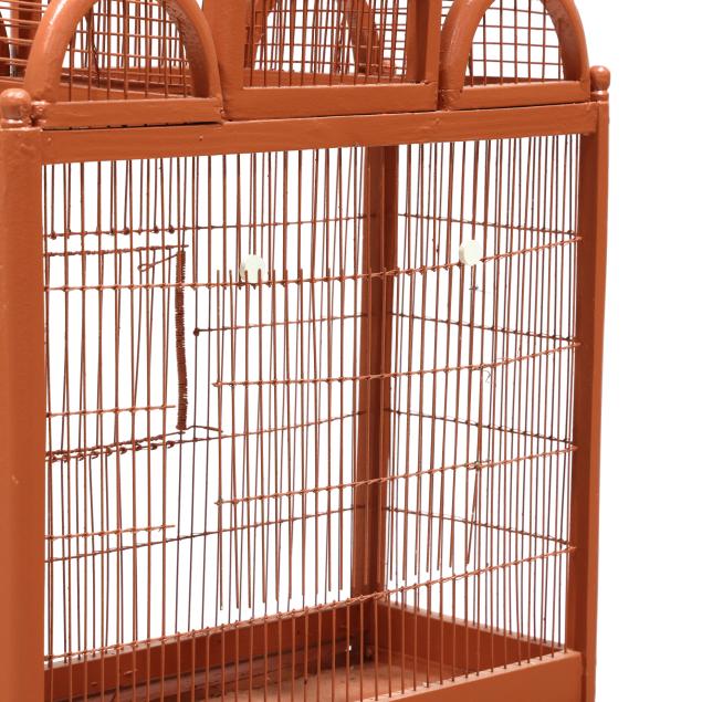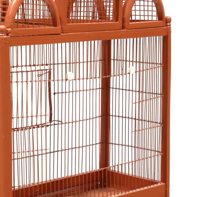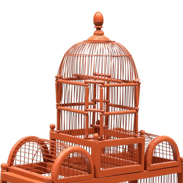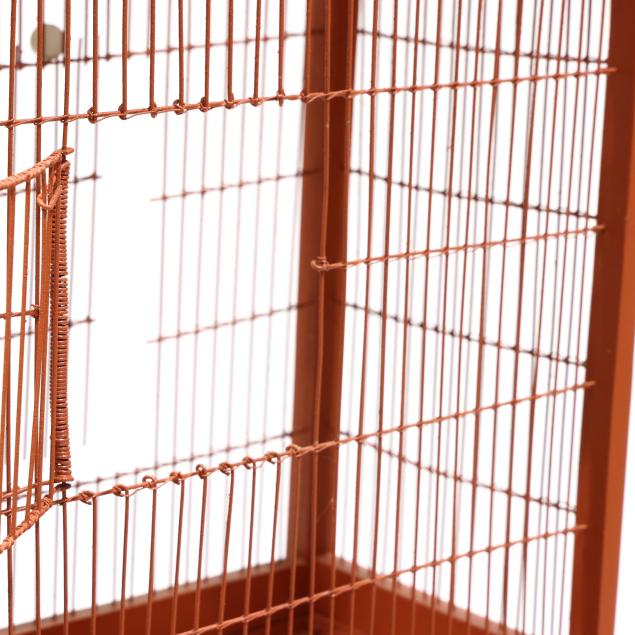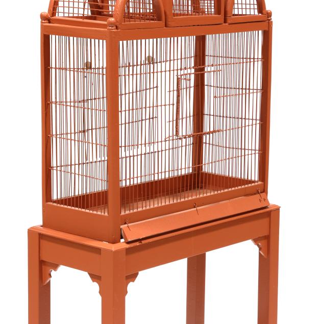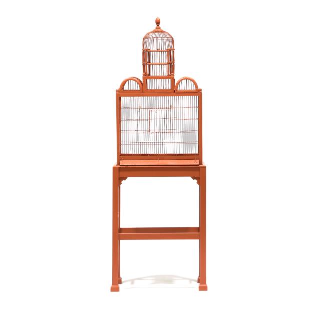 Early 20th century, wood and wire birdcage with hinged door and rear cut-out panel, set on a later custom Chippendale style stand, the whole in later salmon paint.