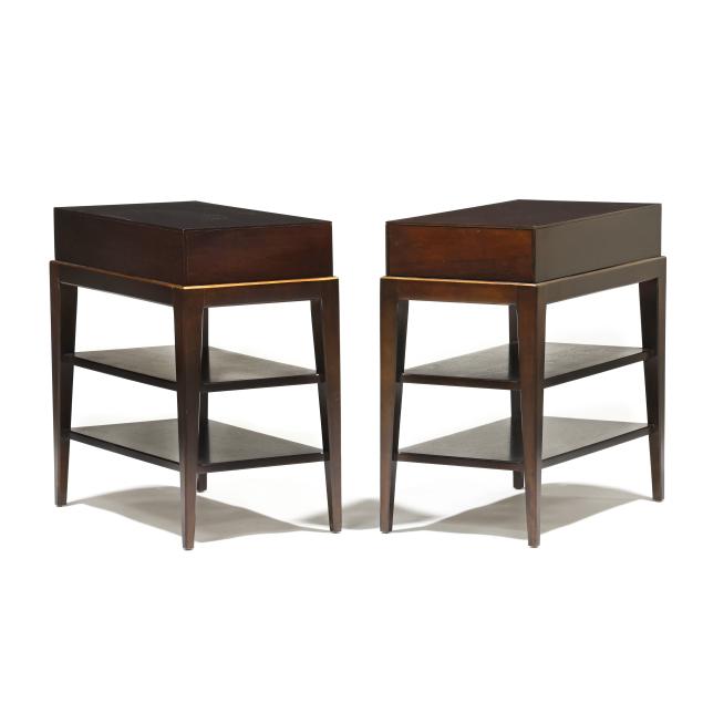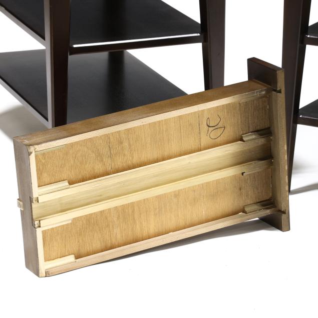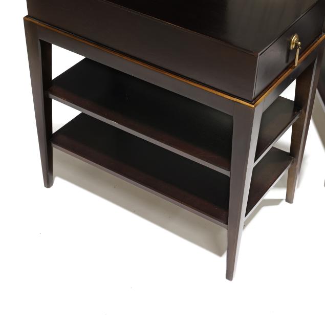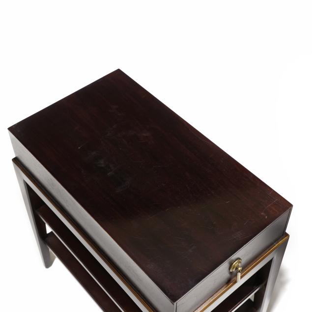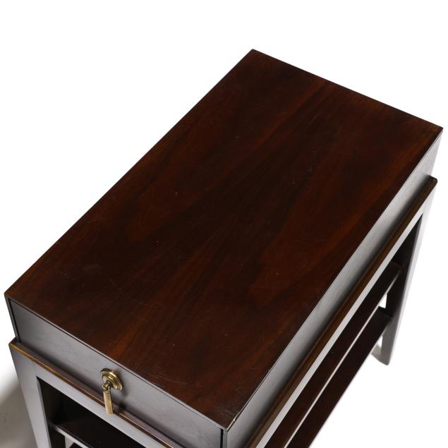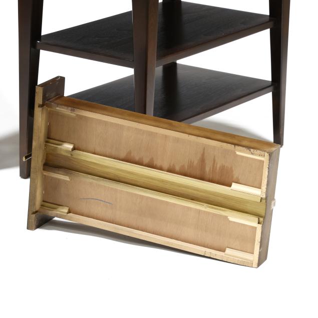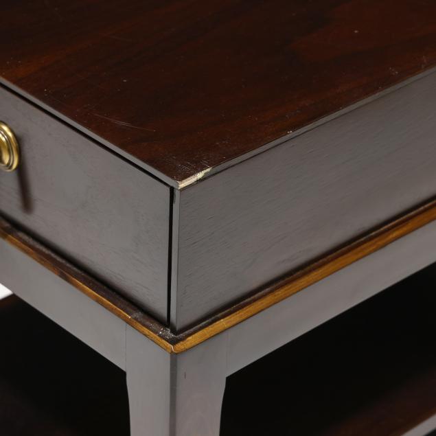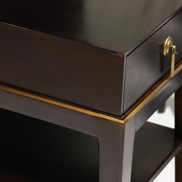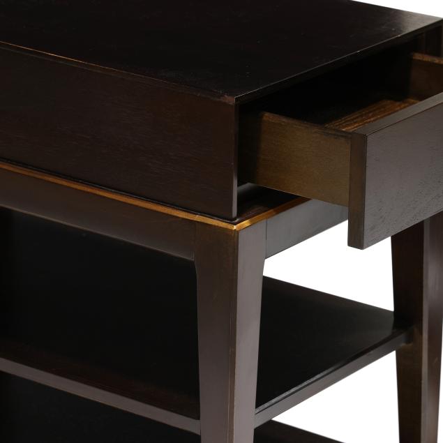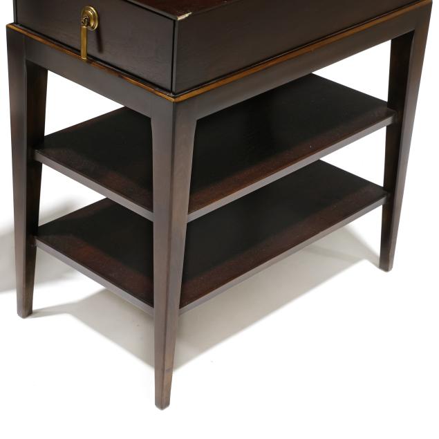 Walnut veneer, single flush drawer, gilt highlighted edge, two lower shelves, tapered legs, labeled.