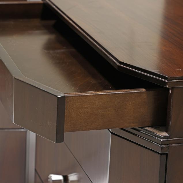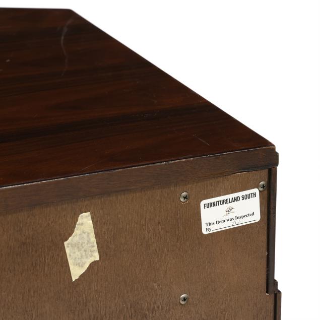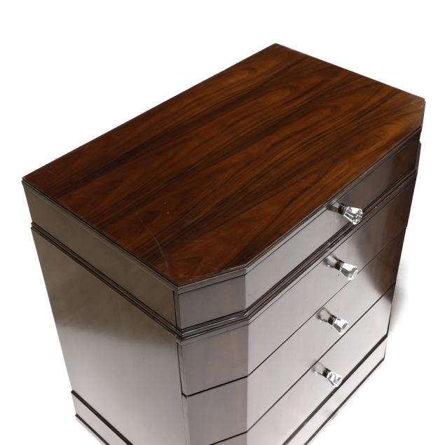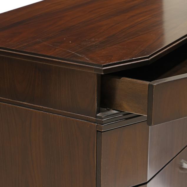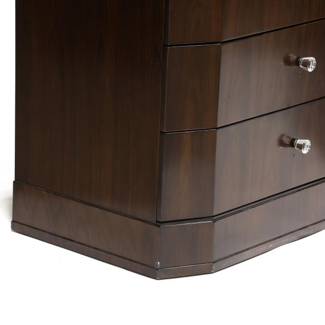 Contemporary, rosewood veneer, rectangular form with canted corners, four drawers with faceted crystal pulls, flush base, labeled.