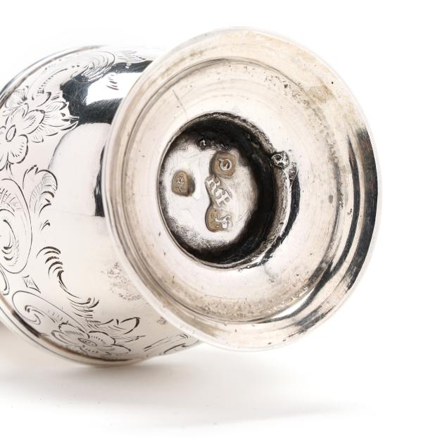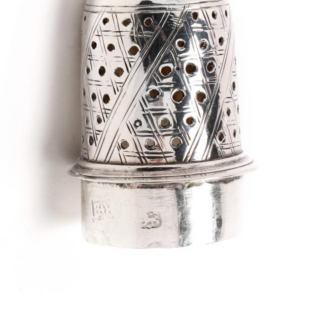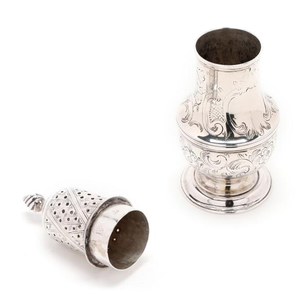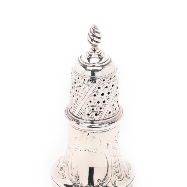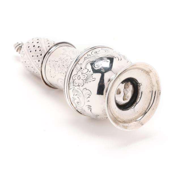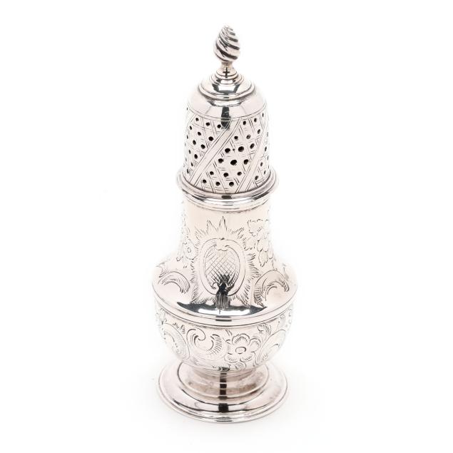 London (1771), featuring a flame finial over a pierced lid, the whole with period engraved foliate, crosshatching, and cartouche decoration, on a pedestal foot.