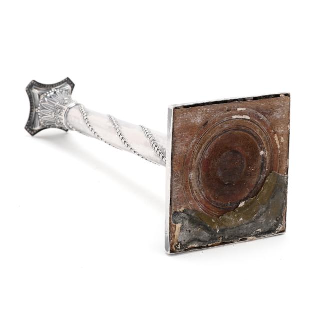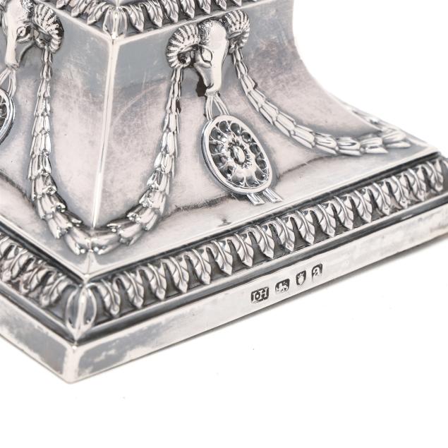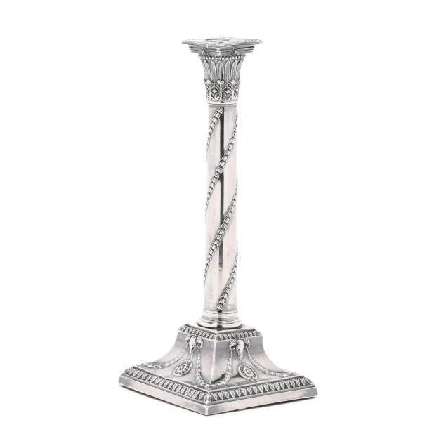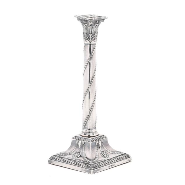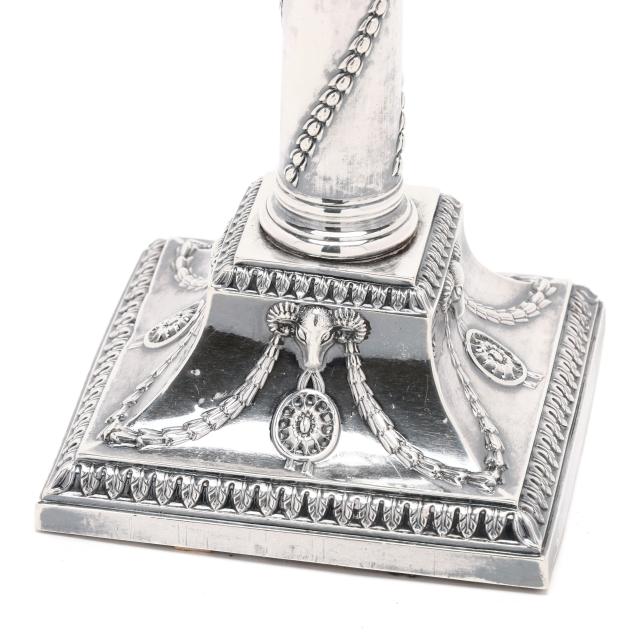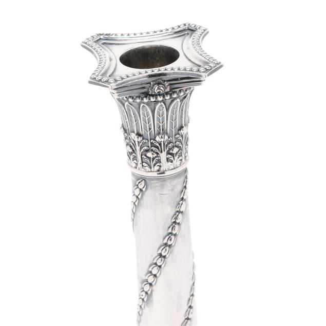 London (1776), the form with a classical relief decorated pedestal base, foliate garland to the shaft, and a Corinthian capital topped with a separate bobeche with a bead course rim and uniform hallmarks, weighted, not monogrammed.