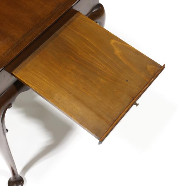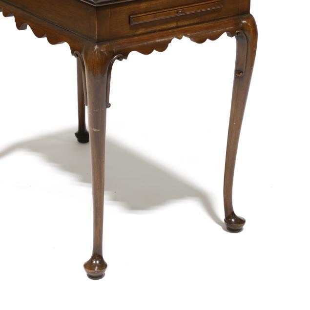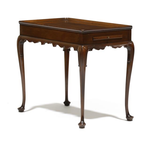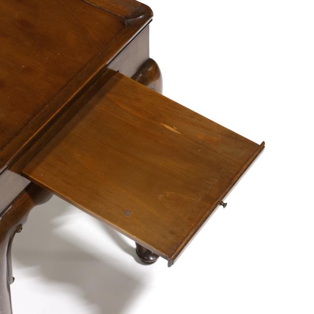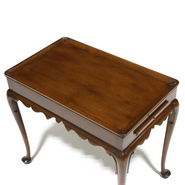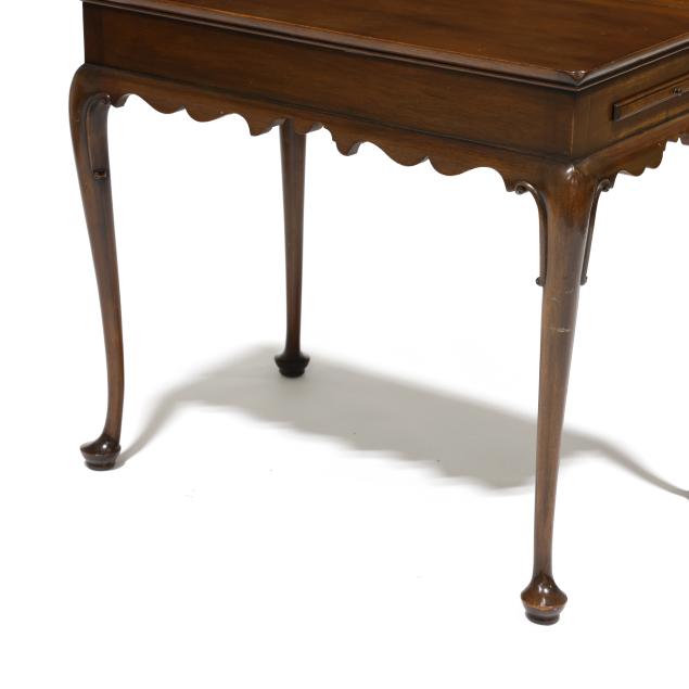 Circa 1970, mahogany, rectangular top with applied molded edge, scalloped skirt, two pull out candle slides, cabriole legs with scrolled returns and pad feet, labeled and marked.