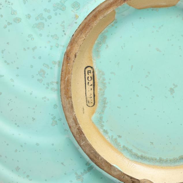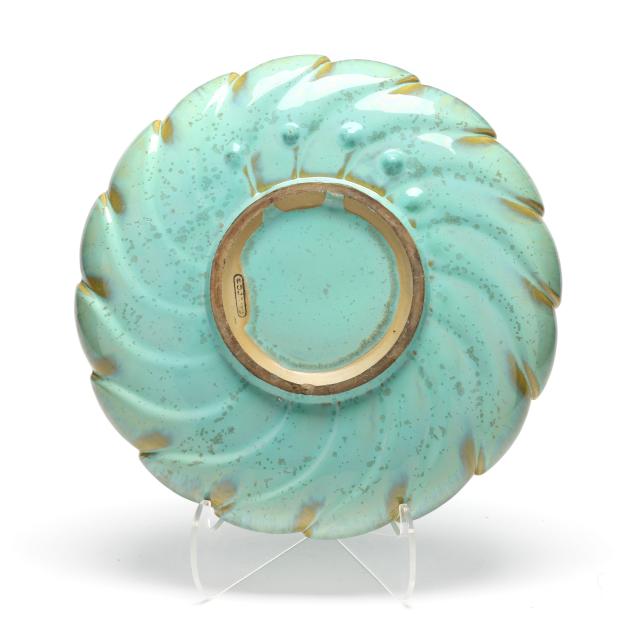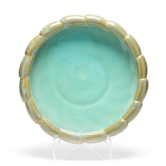 Flemington, New Jersey, 1917-34 oval ink mark to the underside, low bowl with scalloped edge in turquoise and olive green crystalline glazes.