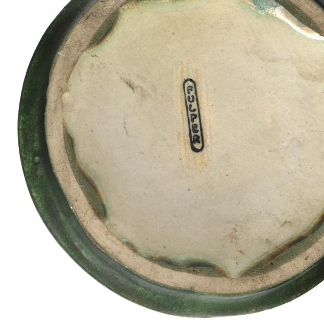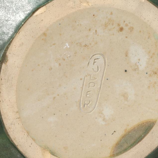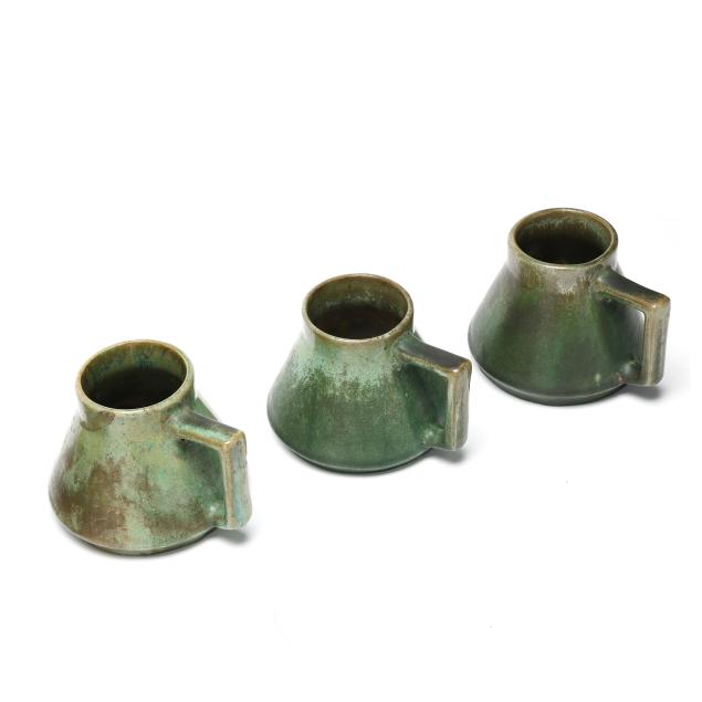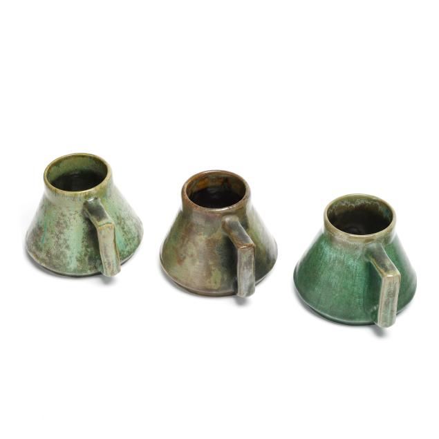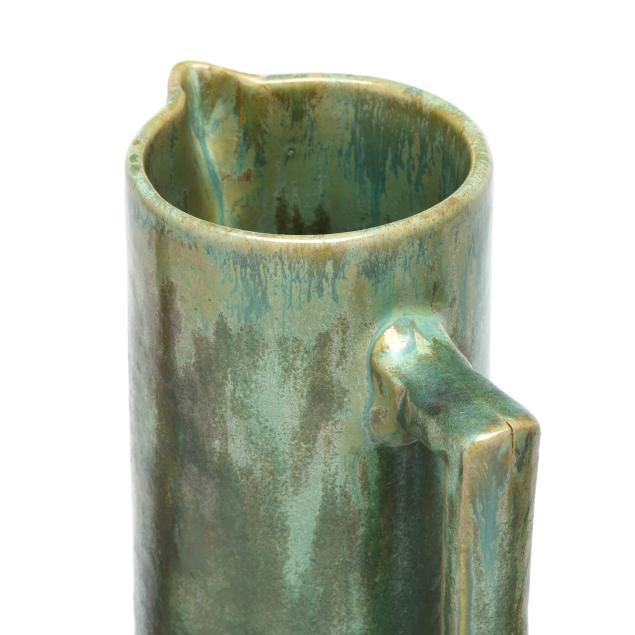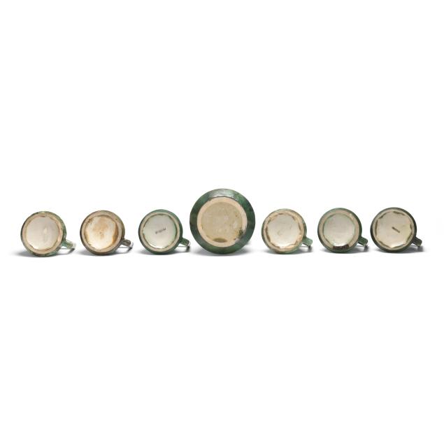 Flemington, New Jersey, 1917-34, (7) mottled green and tan glazed pieces, including (1) tall handled pitcher (13 in.) and (6) mugs (4 in.), each marked with various company impressed or ink stamp to underside.