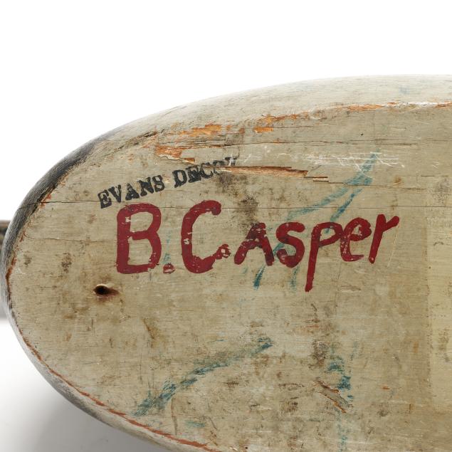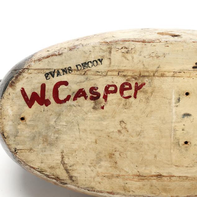 Ladysmith, Wisconsin, circa 1930, carved and painted wood, glass eyes, both retaining the EVANS DECOY stamp, both have painted brand W.CASPER.