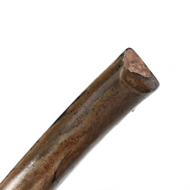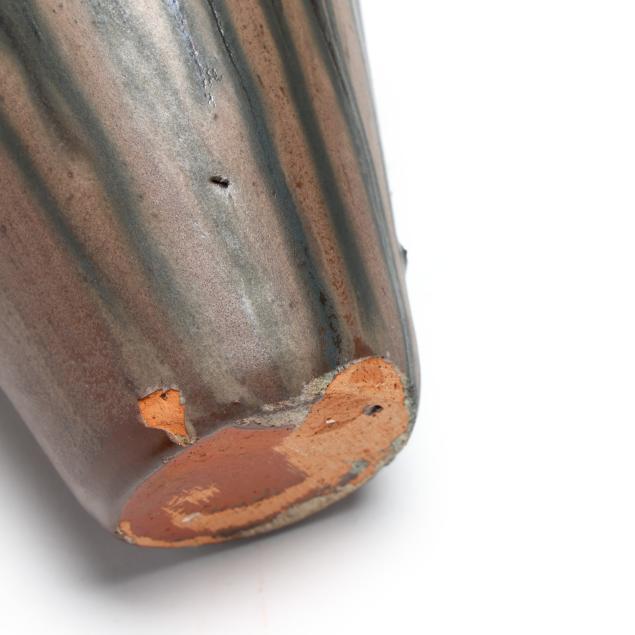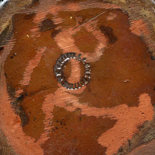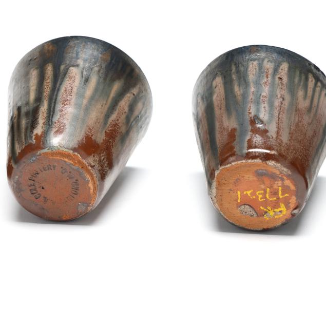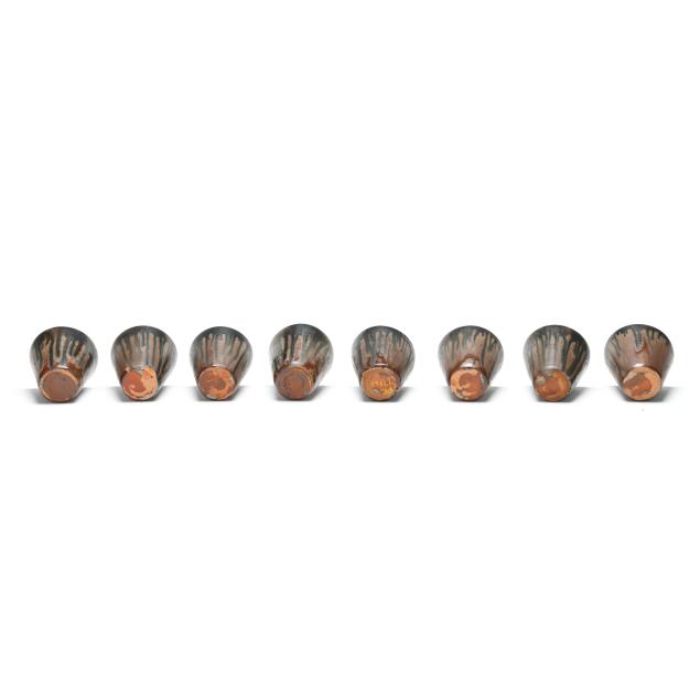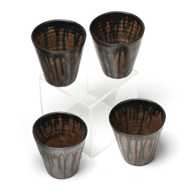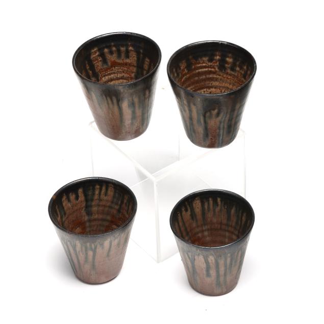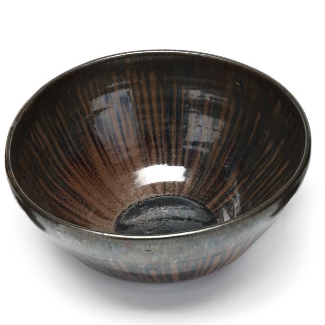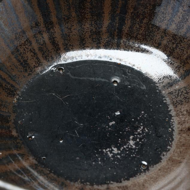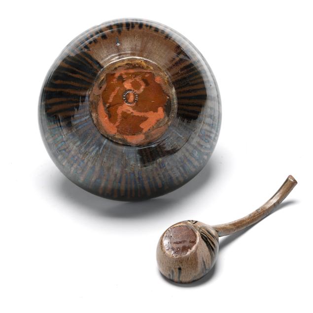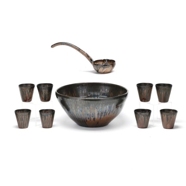 Third quarter 20th century, (10) pieces of glazed earthenware with tan and dark cobalt metallic drip glaze to include (1) large punch bowl (13 1/2 in.); (1) ladle (12 1/4 in.); and (8) cups (3 1/4 in.), all stamped "A.R. COLE POTTERY / SANFORD, N.C." to underside.