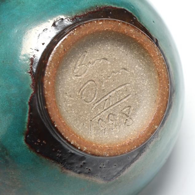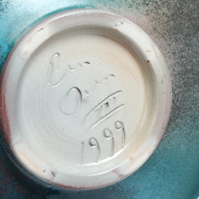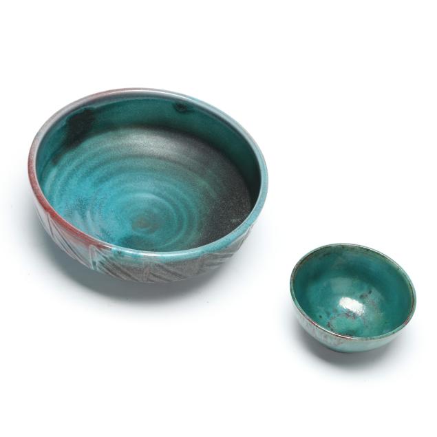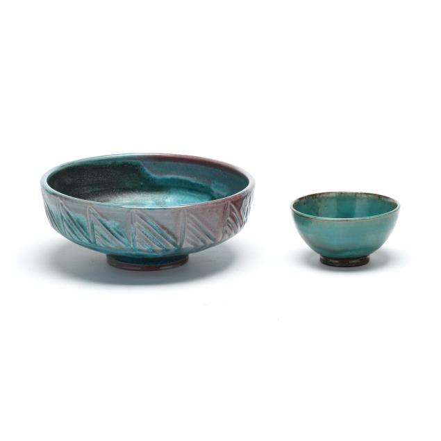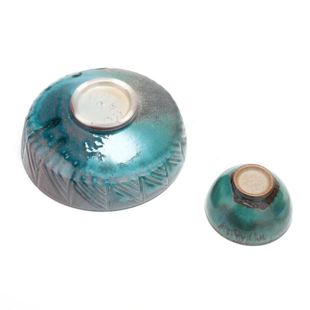 Both footed, to include: the larger with a squared shoulder with incised geometric pattern, with incised signature to underside and dated 1999; the second a small flared bowl, with incised signature to underside and dated 1998.
