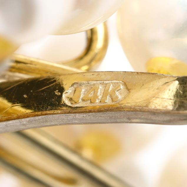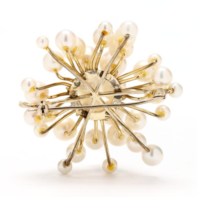 The starburst design with gold rays ending in round cultured post set pearls (3.70mm to 7.90mm), completed with a single locking pin stem, stamped 14K, XRF testing 10KT.