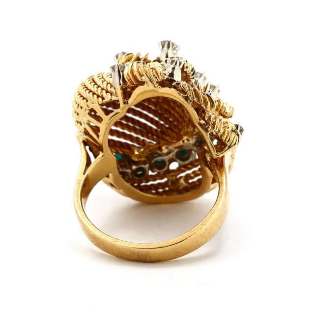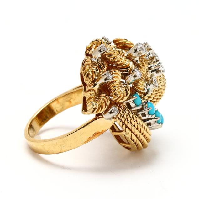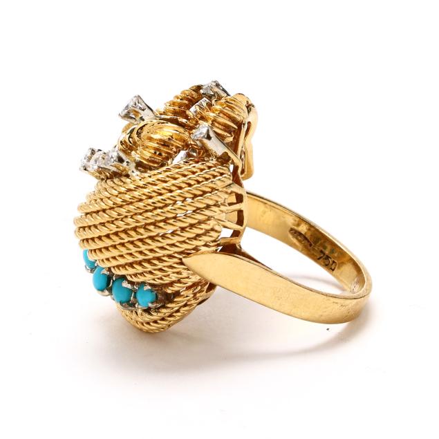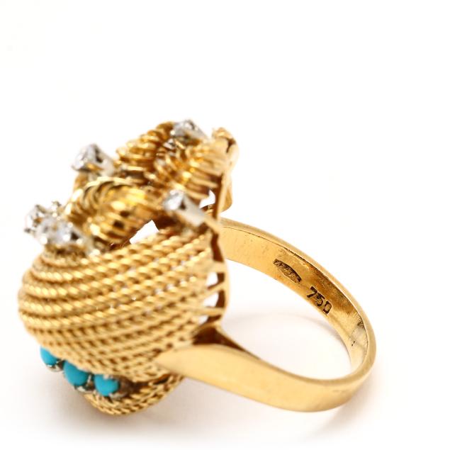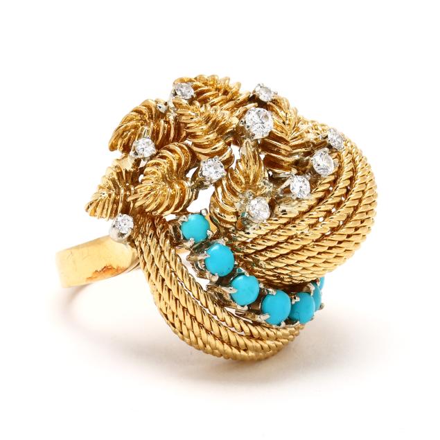 The knotted design set with round cabochon turquoise accents, and with prong set full cut round diamond melee, stamped 750 and with an Italian Registry mark.