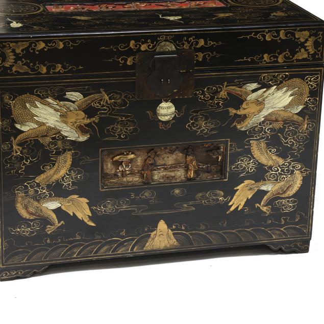 Second half 20th century, black lacquered field with relief carved, painted and gilt panels, open interior.