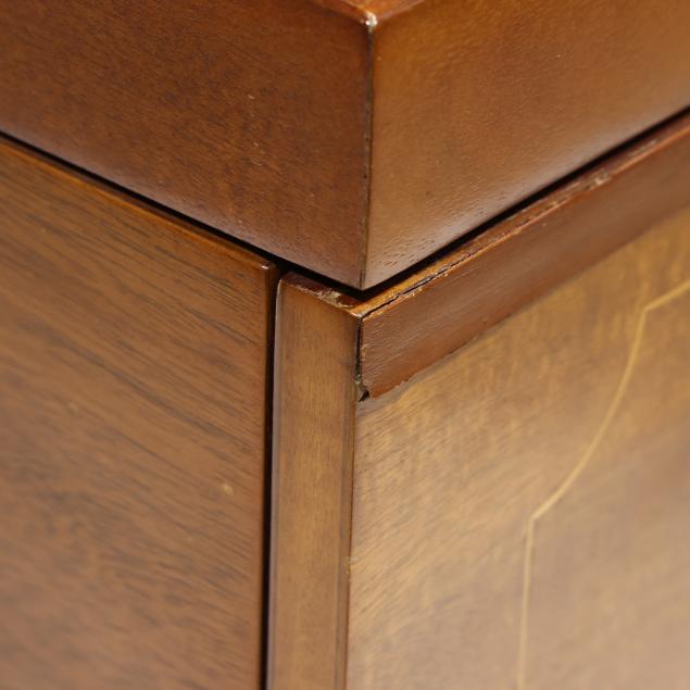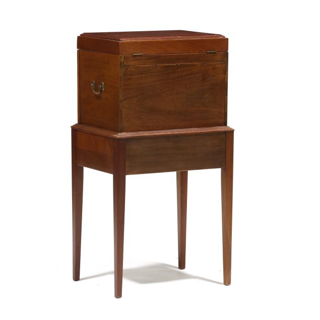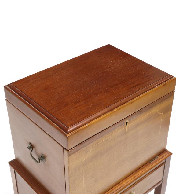 Likely originally a Henkel Harris silver chest; now altered and with later interior compartments for use as a cellarette; sun fading; no key.