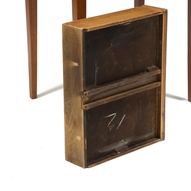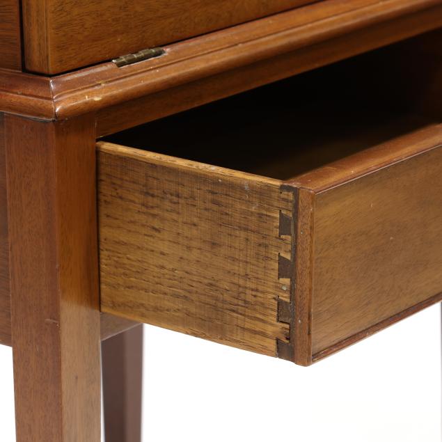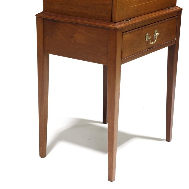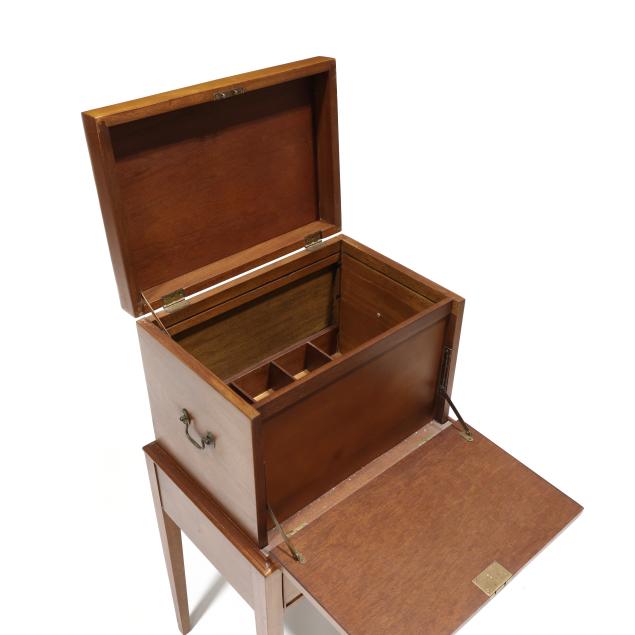 Mid-20th century, hinged lid, fall front inlaid panel, interior with divided compartments, single cock beaded drawer, tall tapered legs, unmarked.