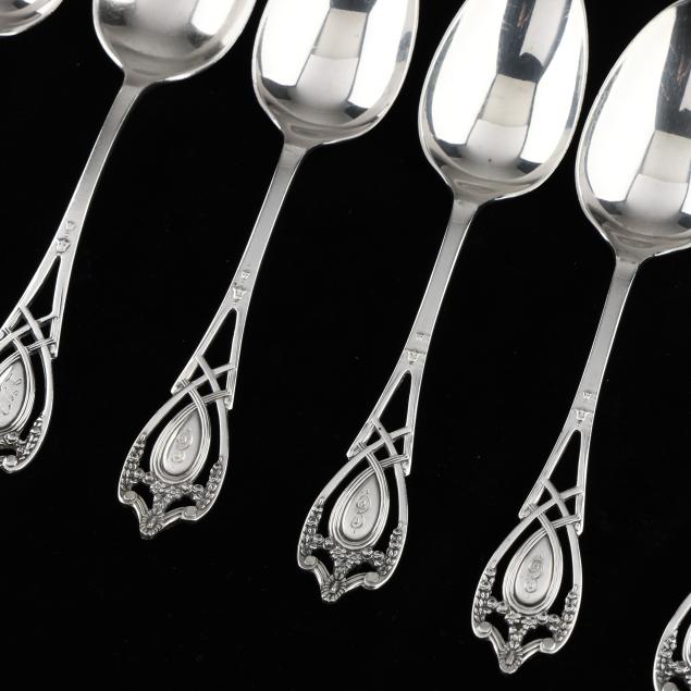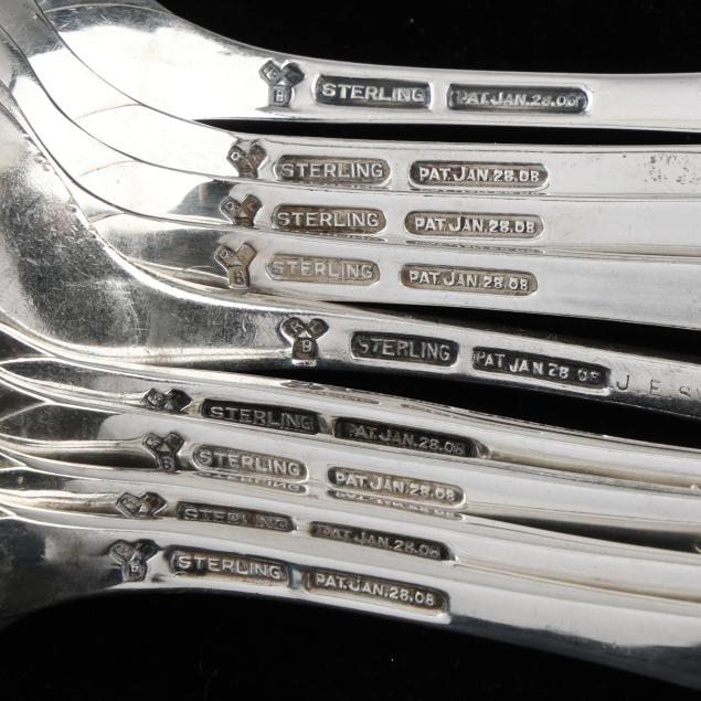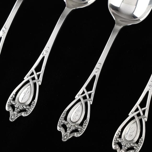 Mark of Lunt, with openwork shield form handles, one slightly larger in size with retail mark of J. F. Swarthout & Co, monogrammed, all with various dates engraved to the verso.