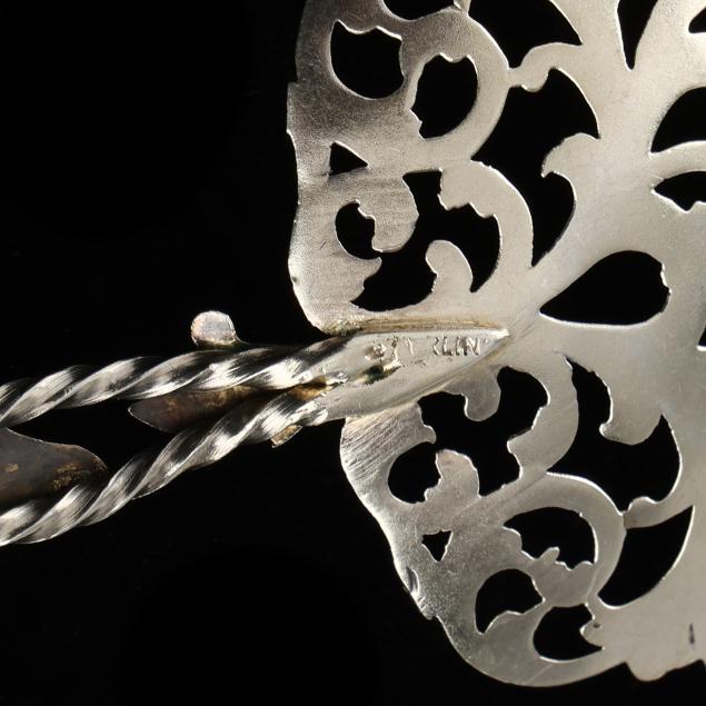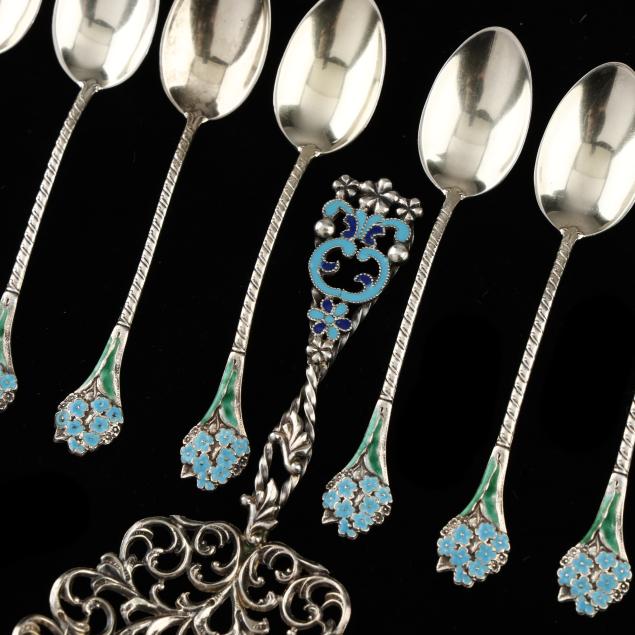 Includes a set of (12) Gorham demitasse spoons, pattern number 808, with gold wash bowls and enameled floral bouquet handles, not monogrammed (2 3/4 in.); and a bon bon spoon, with openwork bowl and twisted blue enamel handle, marked "sterling", monogrammed to verso handle (4 5/8 in.).